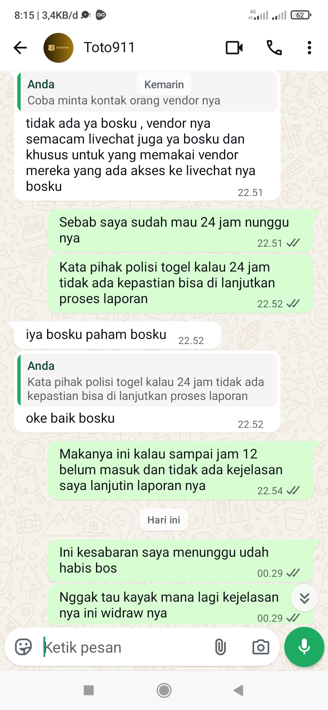 Coba bos Richard hubungi aja tim toto911 tanyakan pasti alasan nya kendalanya di vendor saya nunggu sudah hampir 3 hari terus saya chat whatsapp tidak ada respon lagi di live chat juga jawaban itu itu aja nggak ada kejelasan nya kala bos Richard meminta bukti lain ini saya masih ada banyak bukti nya