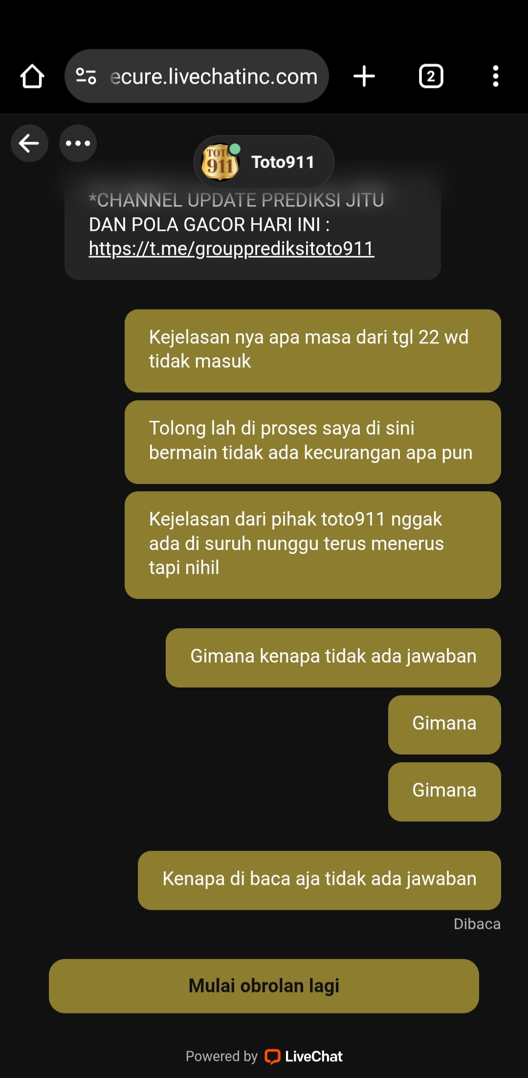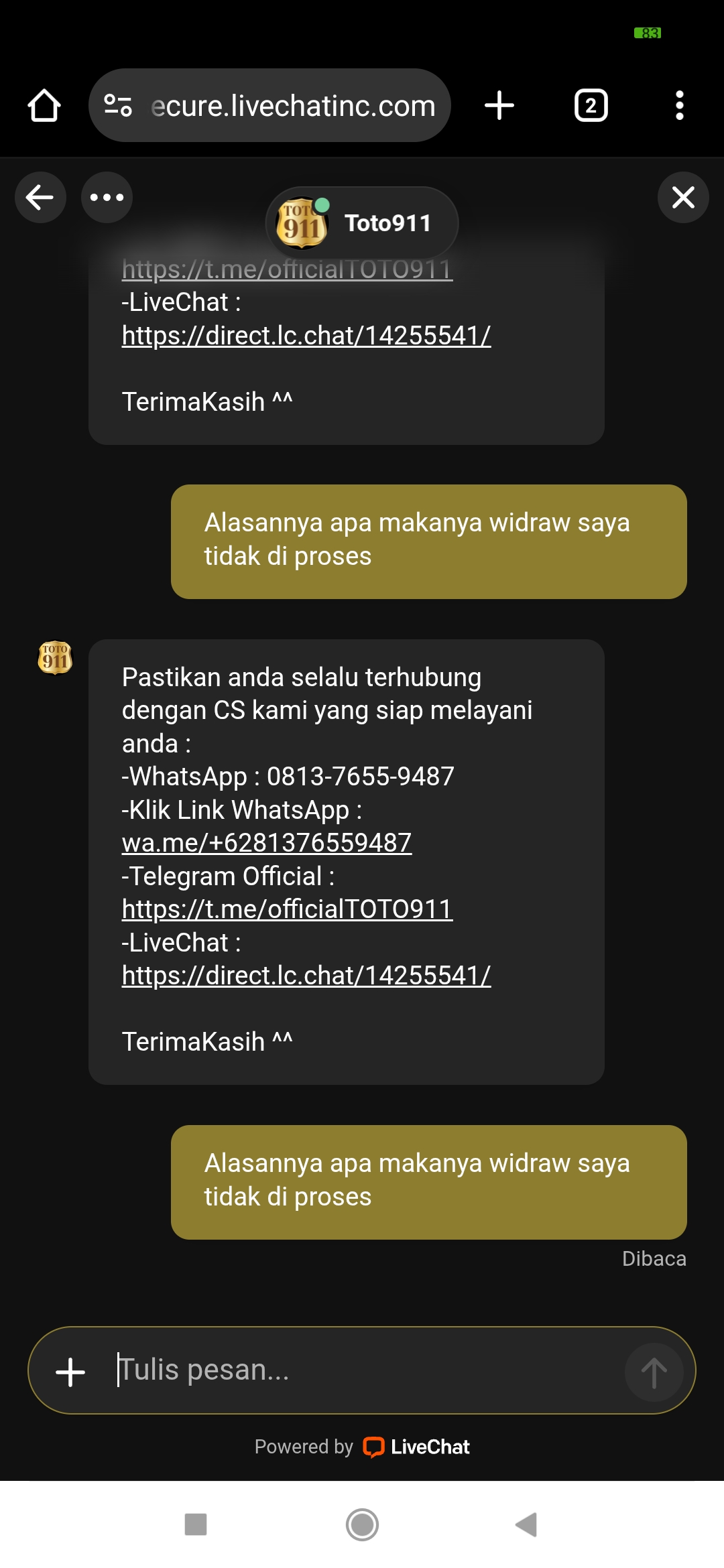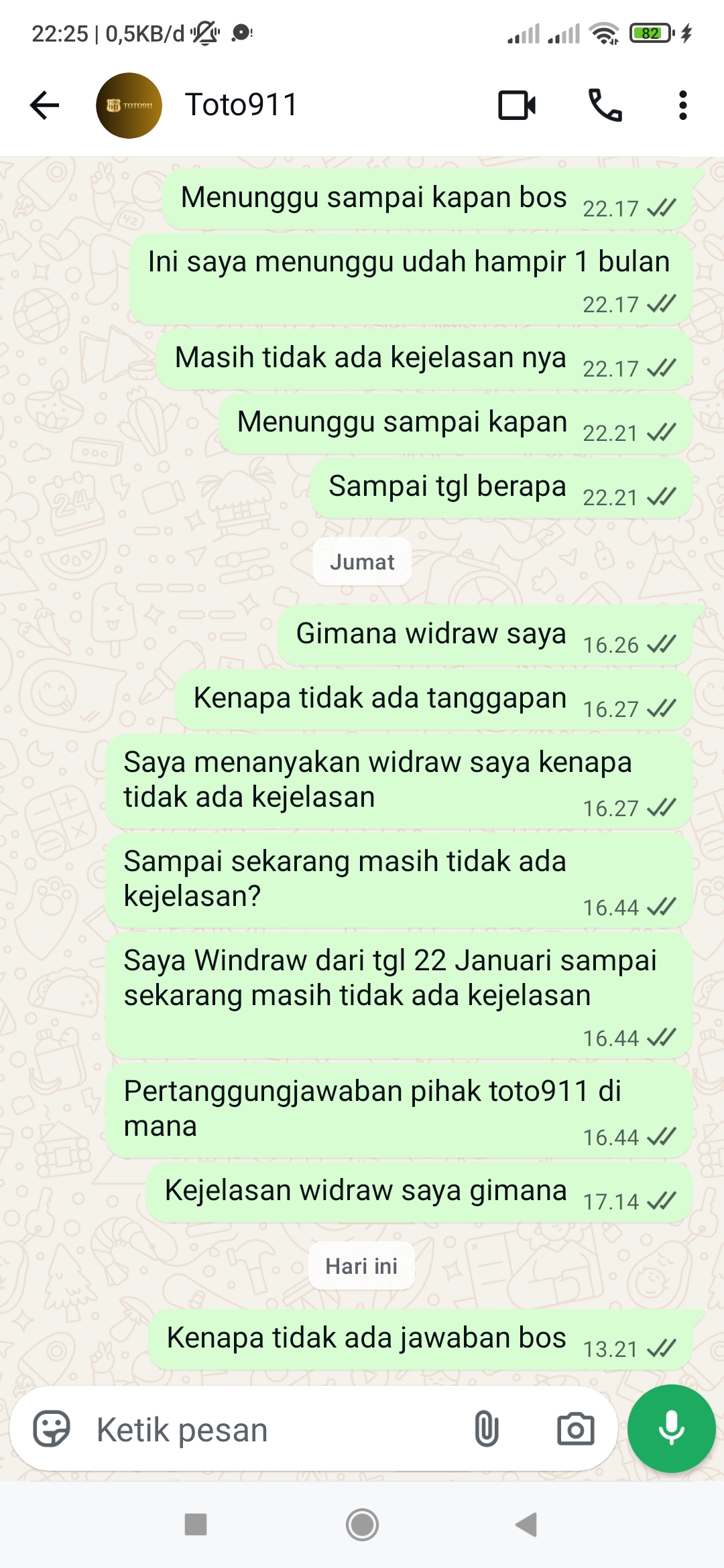 Ini bukti nya bos saya menanyakan kejelasan widraw saya di live chat selalu mereka tutup obrolannya saya chat ke WA di blokir memang situs melakukan penipuan toto911 masukin aja daftar bleclist bos