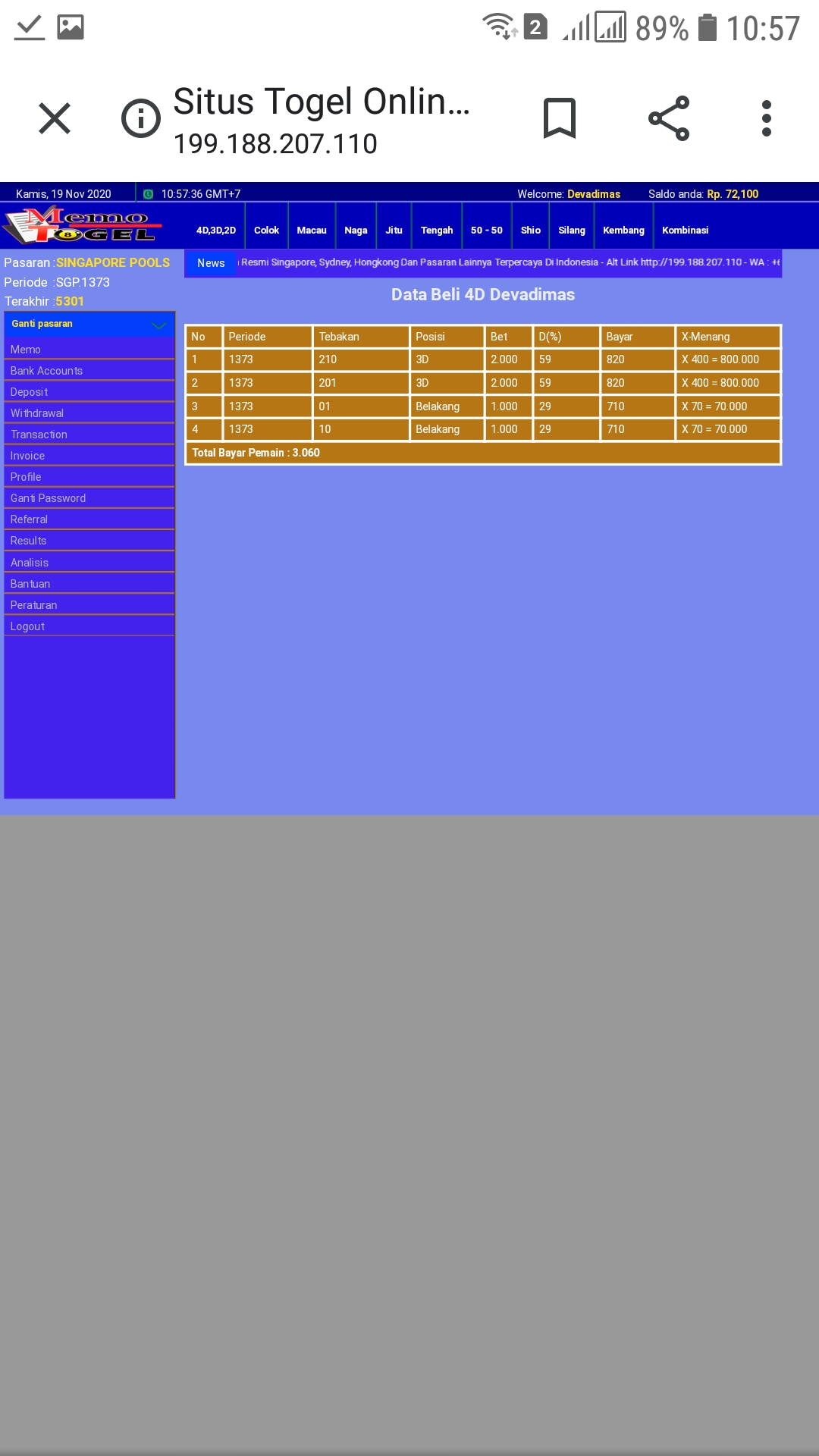 1. Sama dengan saya ini…saya menang 3D dan 2D Hongkong tanggal 26 11 2020…tapi diblokir akun aaya…saya livechat dia minta KTP, Buku Bank dan Print Tabungan dengan alasan verifikasi data