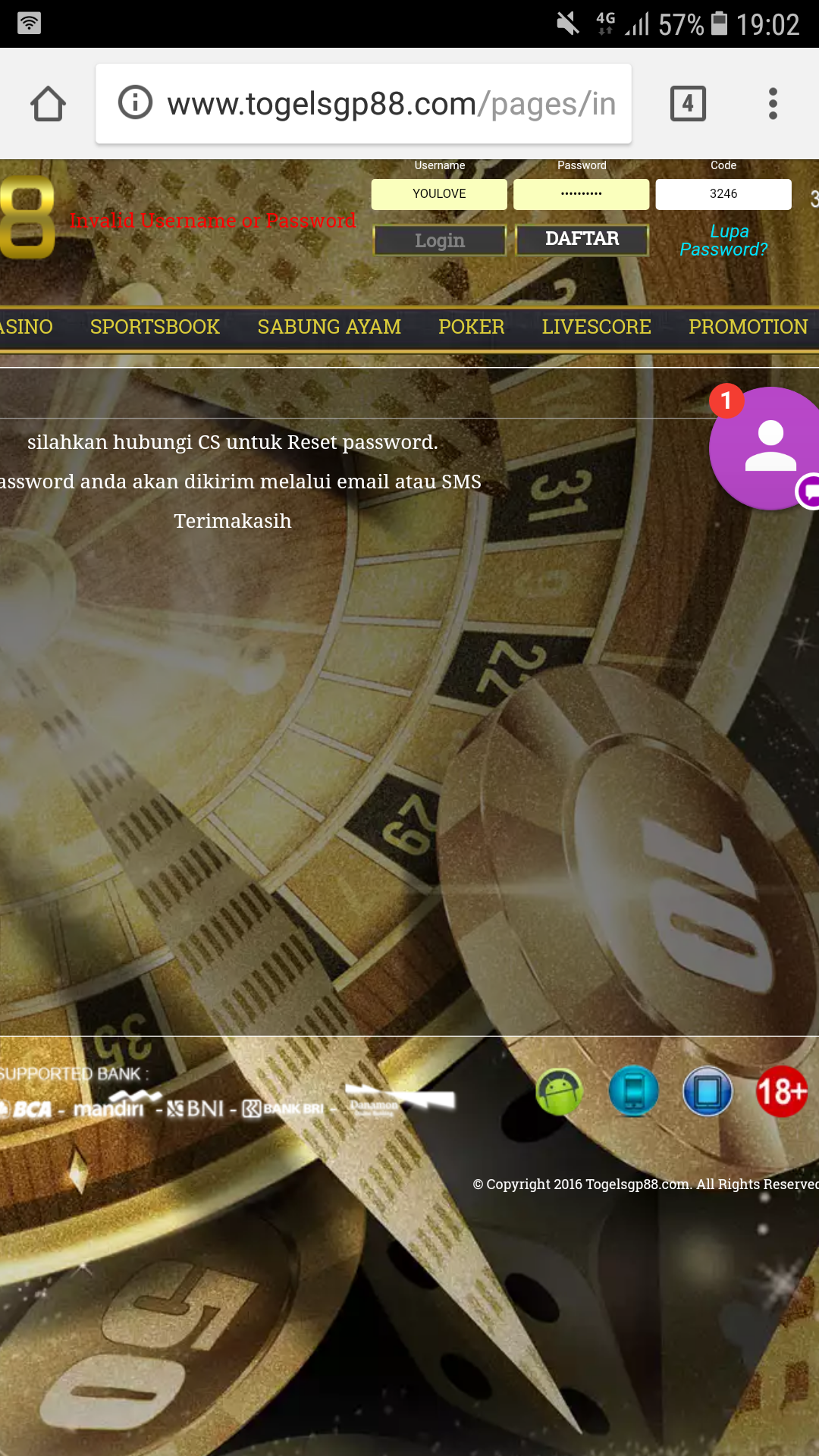 BOS mohon di bantu. Setelah no saya tembus hongkong tgl 7-12-2017 dengan 2D – 23×250.000 + colok angka 3 di KOP x 100.000 di http://www.togelsgp88.com. tiba2 setelah stengah jam berikutnya saya ingin login lagi udah g bisa lagi dengan alasan pasword user tidak valid.