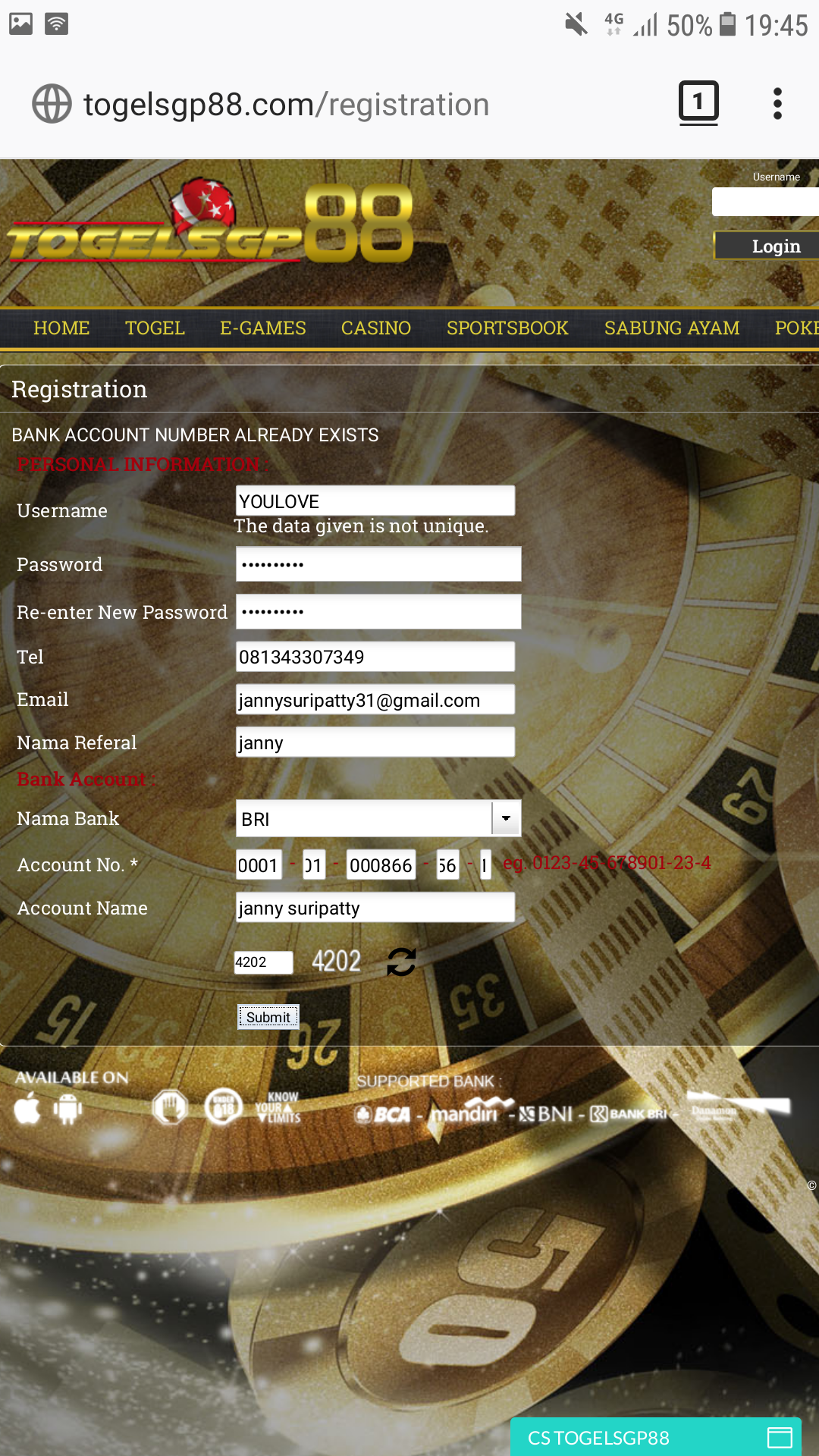 Ini kalau saya coba untuk daftar ulang. Dan di katakan BANK ACCOUNT NUMBER sudah terdaftar berarti memang akun saya yg lama telah di manipulasi oleh admin situs tersebut.