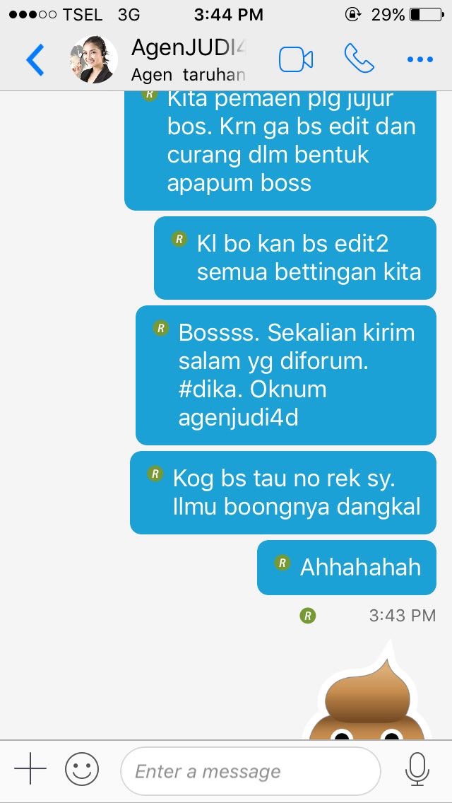 INI SAYA SS HASIL PERCAKAPAN DARI PIHAK AGENJUDI4D.COM DIA COMENT MENYAMAR SEBAGAI MEMBER MEREKA DENGAN MENGGUNAKAN 11 AKUN DENGAN NICK BERBEDA , MARI BERSAMA CEK IP DIA LIAT GAMBAR DI BAWAH DAN KAMI TIDAK TAKUT DENGAN ANCAMAN ANDA UNTUK MENYEBAR BAHWA INI ANDA BILANG DI FITNAH HE LANJUT KAN PERJUANGAN MU BOS AGENJUDI4D DAN KEMUNGKINAN BESAR SUDAH BYK KORBAN PENIPUAN YG ANDA LAKUKAN TERHADAP MEMBER YG TIDAK KAMI KETAHUI..