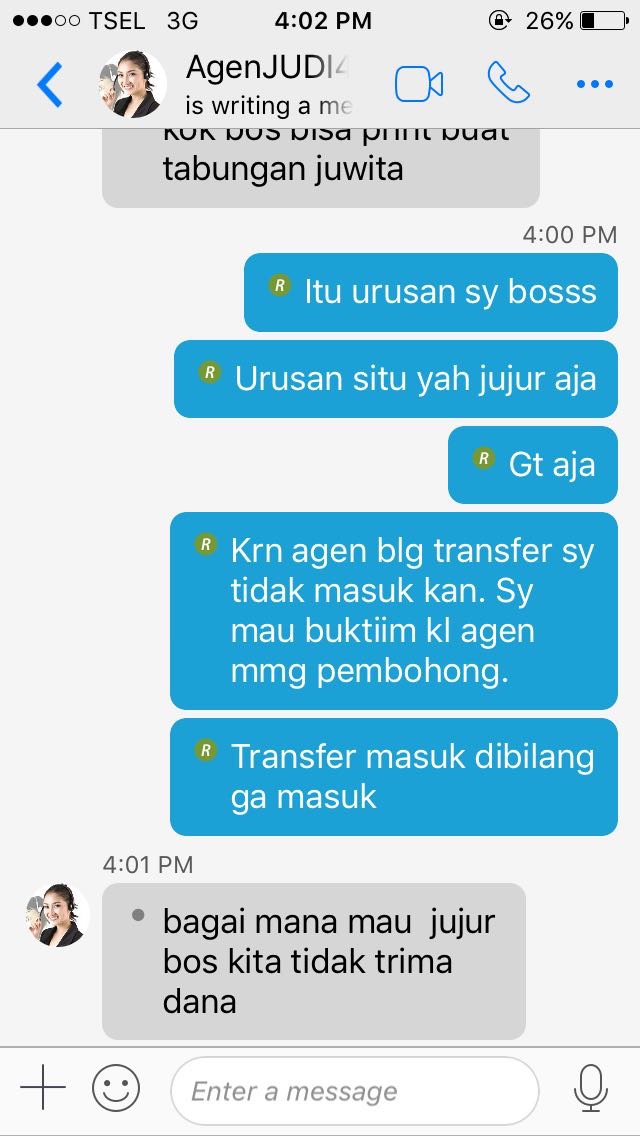 Sy hapus bbm nya krn capek mau jawab pertanyaan yg hanya ga ada ujung nya. Ujung nya jg depo sy tidak diproses. Kl mmg merasa sy menipu agenjudi4d cb buktiin kalian post rek agenjudi4d disini. Kita tgl cocokin saja
