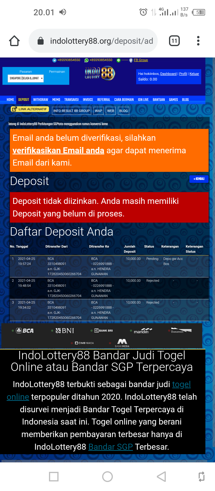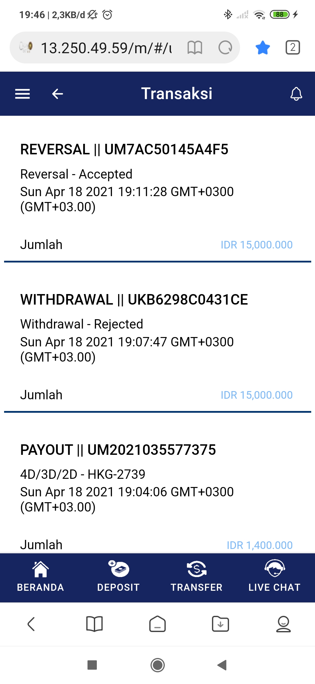 26. Gading4D penipu. SG deposit 2jt win jadi 4jt. Mau WD akun tidak bisa login.livechat off….Besoknya bisa livechat, reset password login bisa , saldo deposit hangus 4jtan. History transaksi diedit untuk ‘ main live casino ‘. Complain live chat di matikan . Via WA juga abis dibaca diblokir. Hati2