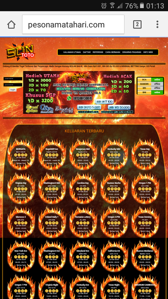 Karena BRAVO TOGEL memberikan diskon terbesar di Indonesia yakni 4D: 65%, 3D: 59% dan 2D: 29%. Mereka meyediakan semua pasaran WLA seperti: Togel Singapura, New york, carolina, PCSO,bulseye dan banyak lagi nah disini akan kami coba uraikan apa saja pasaran togel yang di main kan di BRAVO TOGEL …..