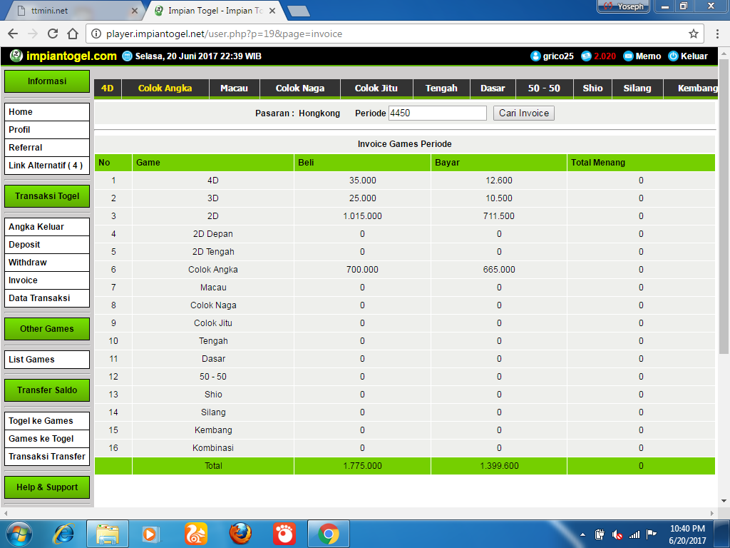 20. Saya korban baru dari BO IMPIAN TOGEL (impiantogel.net), bet pasaran HK periode 4450 bet saya 2d= 77X40.000 Dan Colok bebas angka 7×700.000, result HK=2177, dan setelah result pasangan Saya Bet Saya 2d 77 diganti 37, dan Colok angka 7 diganti 3… saya punya bukti SS dan poto HP sebelum Result. Tolong teman-teman yg maen di BO Impian Togel agar segera cabut dan tarik semua Saldo nya… IMPIAN TOGEL BO Modal dengkul…