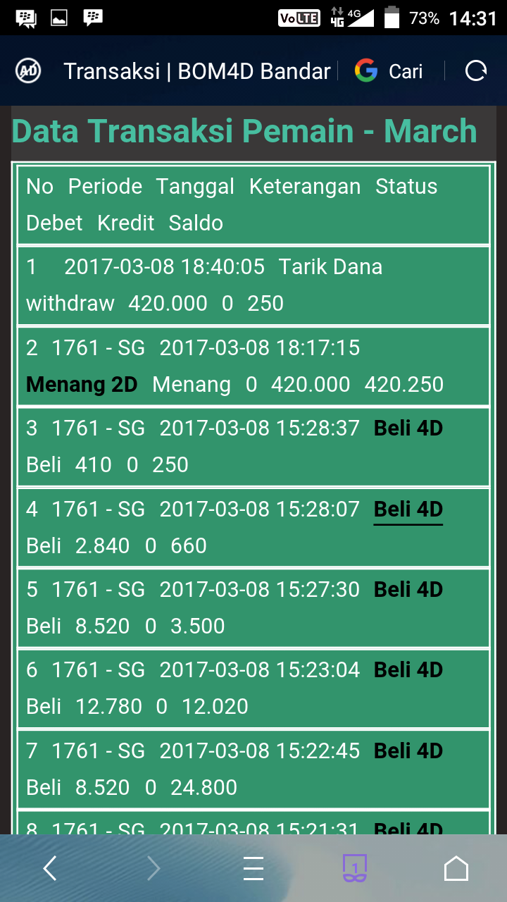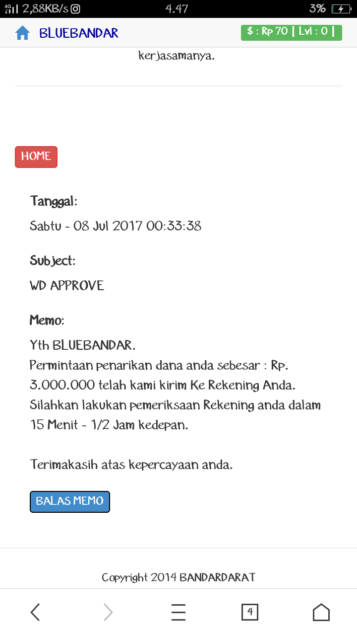 35. Bos mau nanya, Pada tanggal 8 saya melakukam penarikan dana 3000.000 , dana itu ada di dalam ATM tetapi sya tidak bisa melakukan transaksi dana itu seperti beku, dan saat sy menghadap di bank, ternyata agen togel yg saya mainkan tidak pernah mengirim dana tersebut, padahal sesuai memo di akun saya agen togel menginformasikan bahwa dana 3000.000 telah di transfer pada tggl 8 pukul 00.33