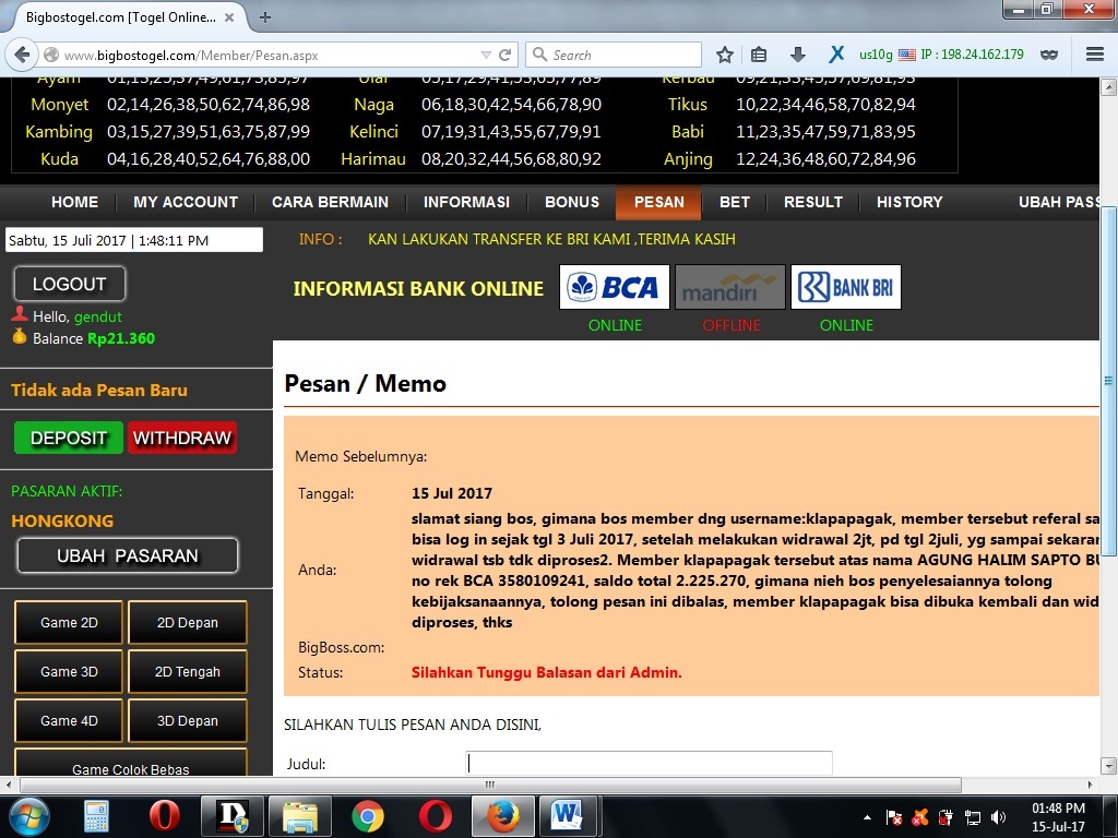 2. saya ada ss widrawal dan bukti rekening bca, dimana widrawal 2jtnya tidak pernah diproses dan member saya sampai sekarang tidak bisa dibuka/diblokir admin bigbostogel sendiri, saya mohon polisi togel benar2 membantu saya samapi selesai, terimakasih sebelumnya