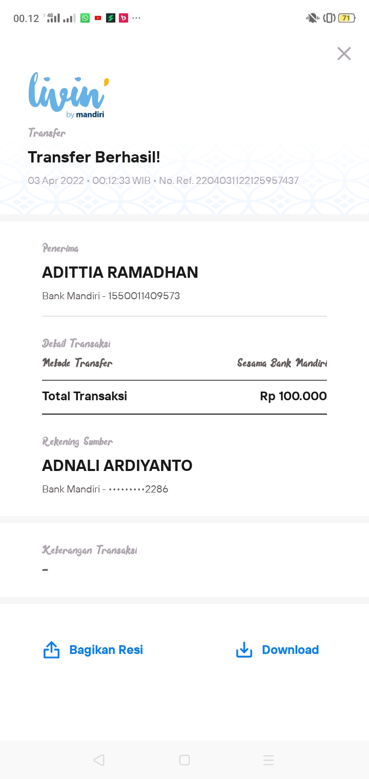 Bank penerima atas nama adittia ramadhan.percakapan si tele langsung di hapus.ilang.