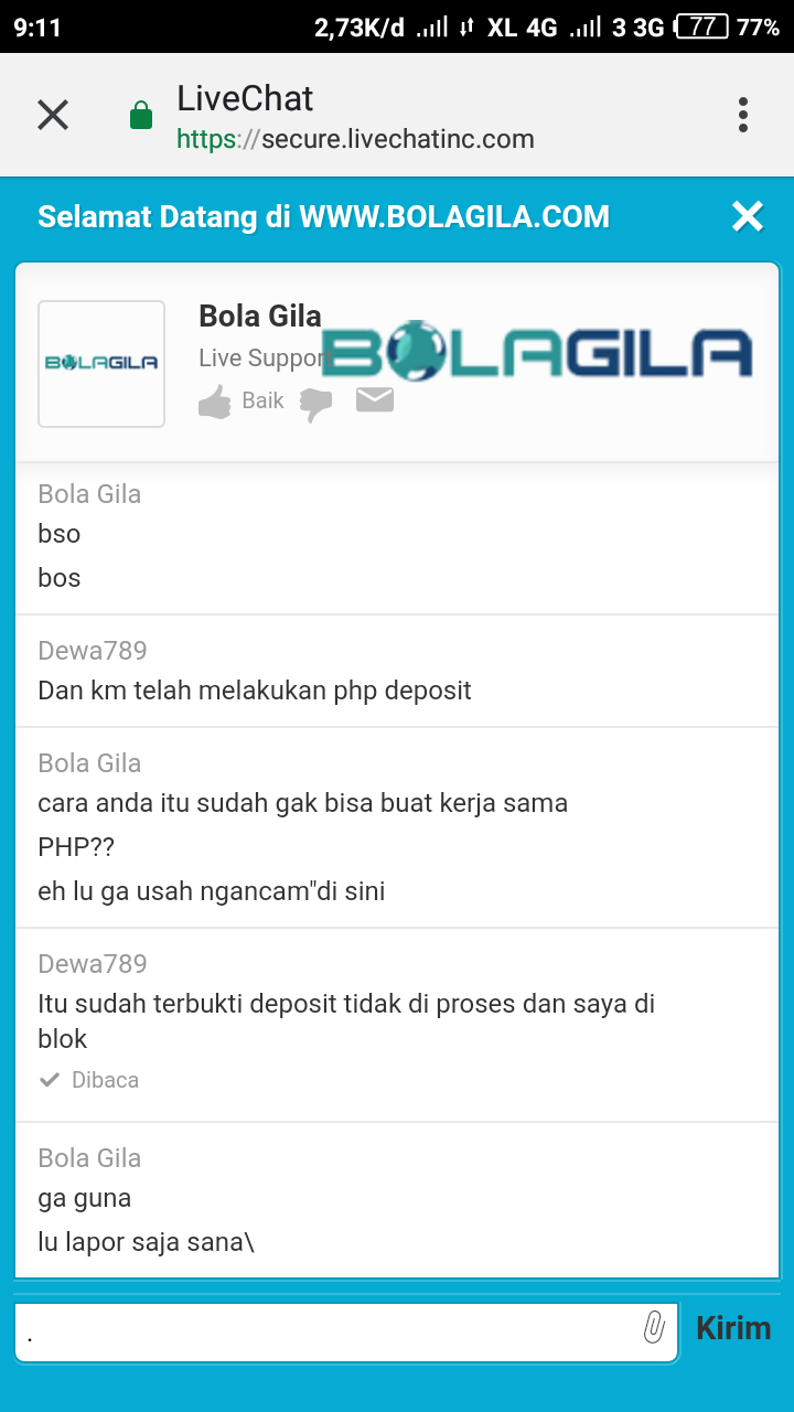 18. Bos tadi saya deposit di bolagila.com saya deposit sampe sekarang tidak masuk.. Dan saya livechat seperti di permainkan bos.. Emang saldo kecil.. Tp seperti mau php.. Atau kita tanya eh… Balik tanya dam seperti mau blaclis. Unsername saya dewa789