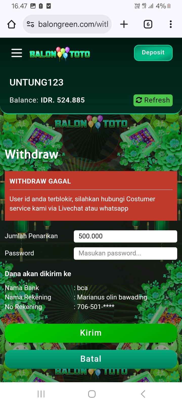 4. coba boss ku pantau situs b.o GUDANG WD ini apa saya WD 4 juta dari tadi malam belum juga di proses alasan nya ada kendala di bank nya mereka dan kemudian saldo nya kembali ke akun lagi