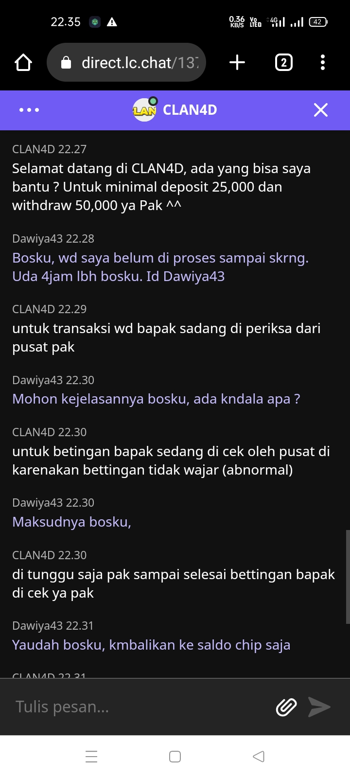 Bosku, mohon di tindak lanjuti clan4d. Proses wd saya belum di proses dri tadi. Di live chat alasan terus. Mohon di tindak lanjuti bosku.