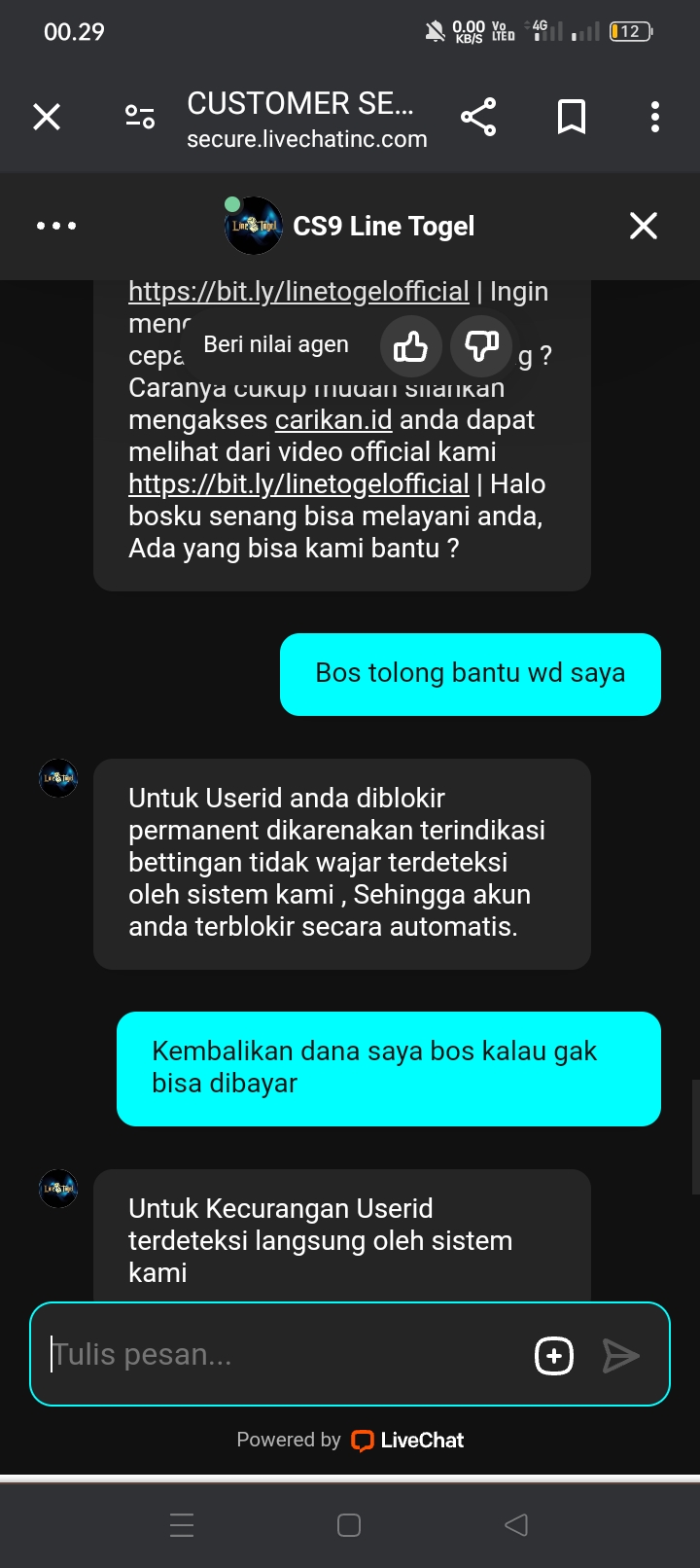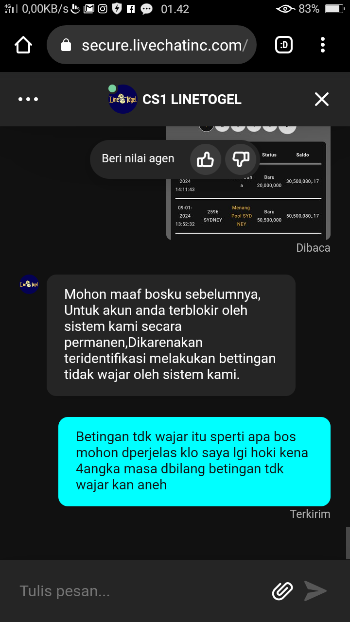 Mohon dibantu bos saya mrasa dirugikan saya depo pakai uang juga bos ,saya kena 4angka togel dsitus linetogel malah dblokir oleh sistem nya pdhl saya sama sekali tdk curang dan biasanya saya kena 1juta dbyr tpi pas saya kena 4angka 50juta 500 malah dblokir bos mohon dtindak lanjuti bos uang saya mlayang tolong dibantu bos🙏