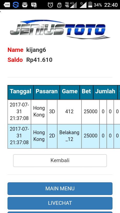 2. wah parah….tadinya saya main di situ….menang 3D,2D#1000 di bayar…tottal kemenangan saya sekitar 2 jutaan (mainnya hampir 2 bulan)…coba klw saya tembus 4D, pasti langsung di edit juga betingannya….padahal ada rencana buat jadi bandar darat….thanks atas infonya…(td saya juga sempat login ke jenius toto, dan menanyakan info tersebut, tiba tiba chat langsung di tutup. Tak seperti biasanya)