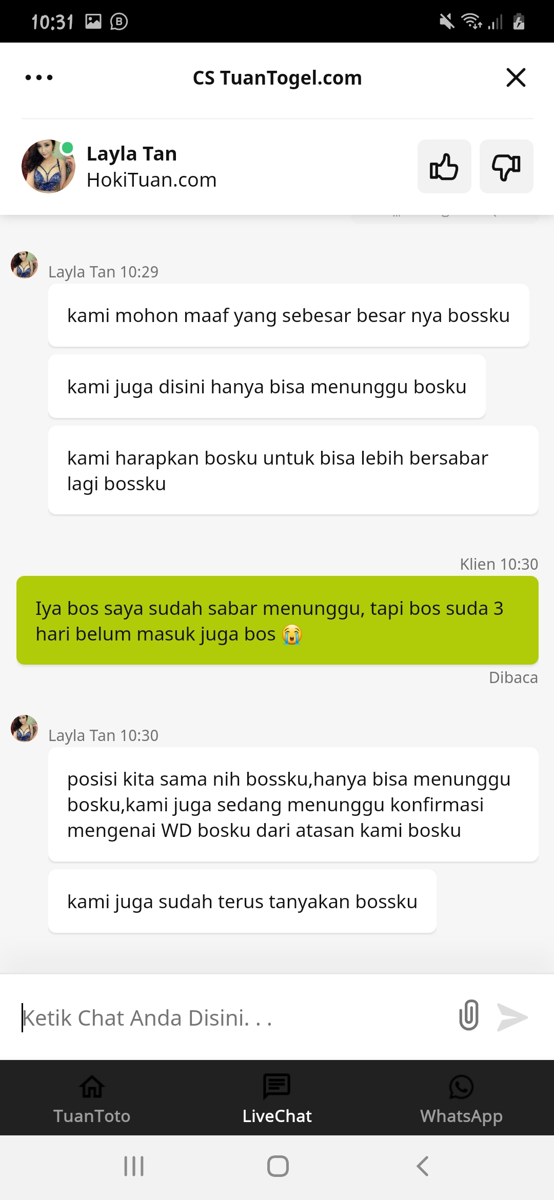 31. Sudah di hubungi bos dari hari pertama wd smapai sekarang masih tetap di hubungi, tapi alasan nya selalu dalam proses pengecekan, mereka minta data untuk verifikasi sudah saya penuhi tapi setiap di tanya alasan nya selalu dalam pengecekan mohon bersabar menunggu