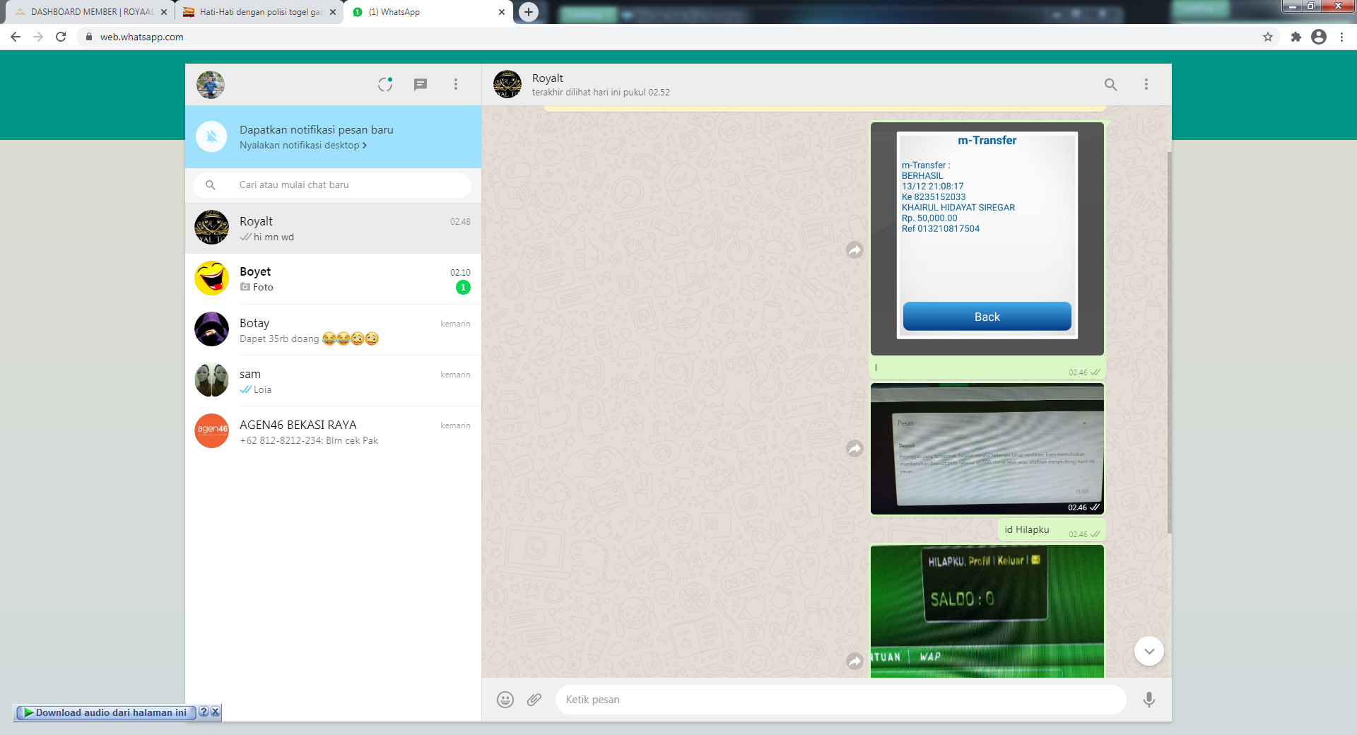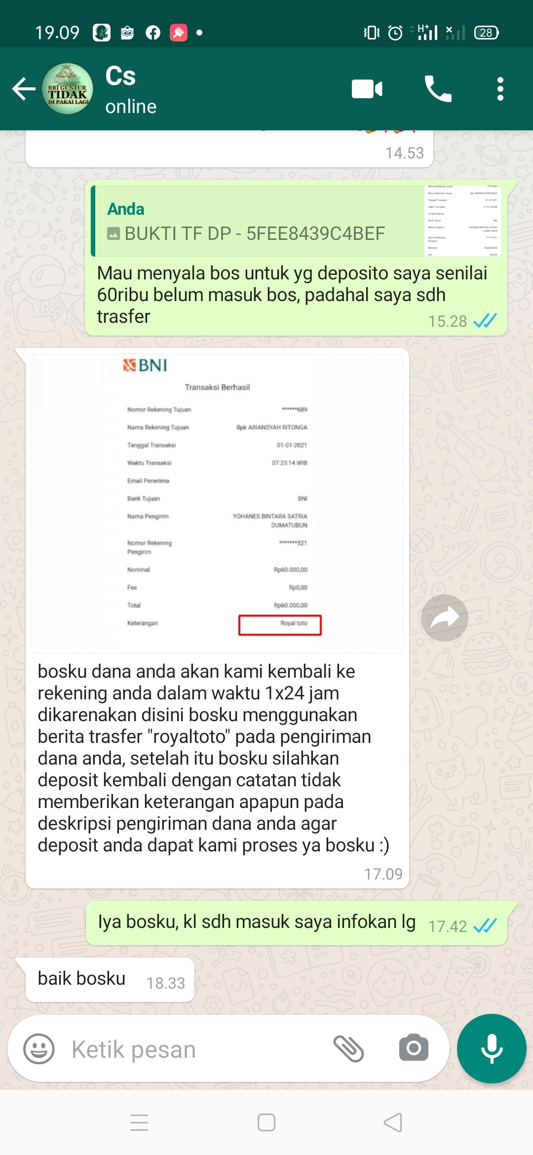 15. Gan saya deposit ga masuk2 di Royaltoto di wa ga di balas ini nipu apa tidak si gan mohon pencerahan, malah dap[et balasan deposit di tolak uang sudah masuk