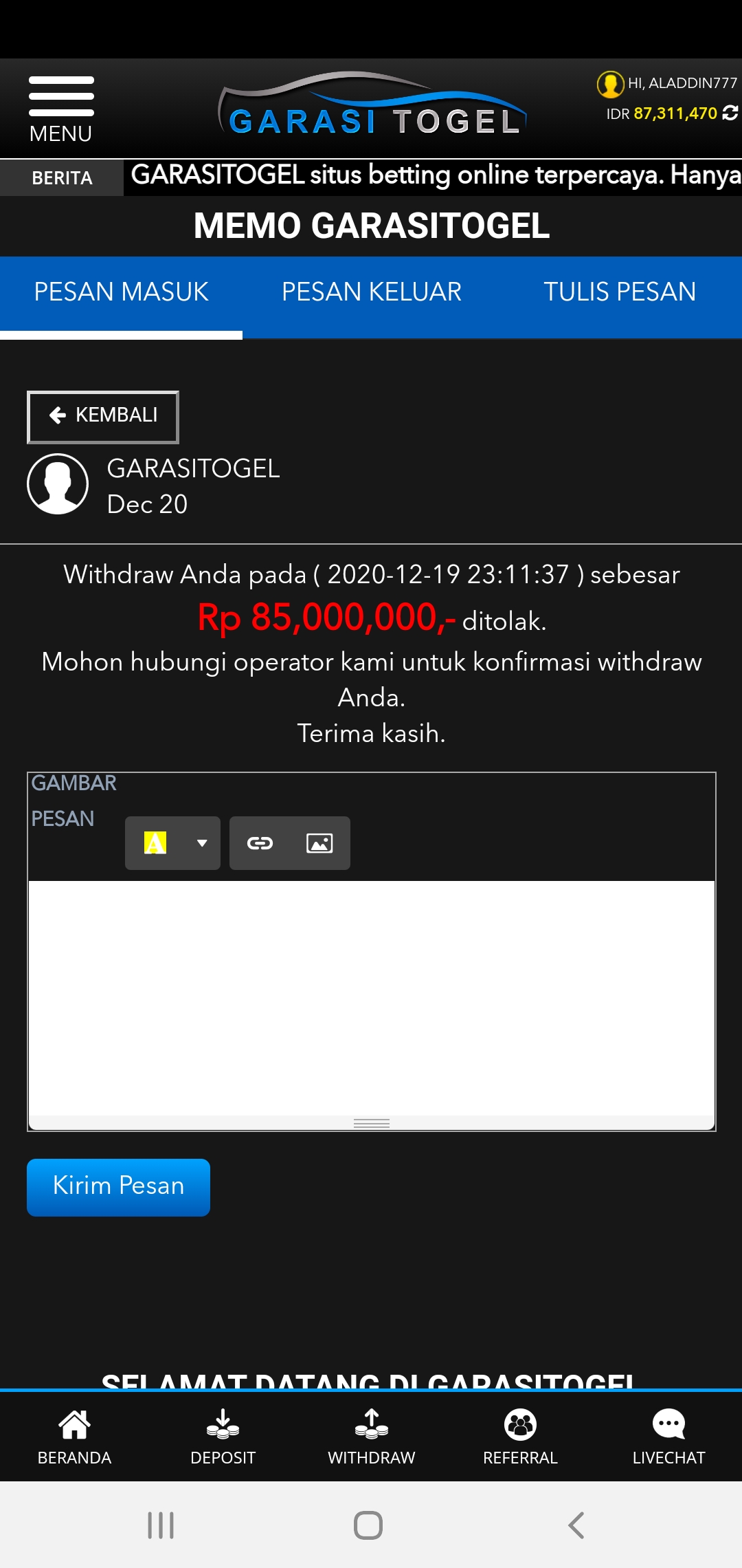24. Siapa bilang GARASI TOGEL jujur? Baru sabtu malam 19 des 20 JP Hk 4D 94jt ga bisa di tarik dananya, alasan Garasi togel kalau mau tarik harus foto sambil pegang buku tabungan dan ktp, gila kali, memangnya kita NAPI, giliran kalah mereka diam2 aja, dasar GARASI TOGEL PENIPU