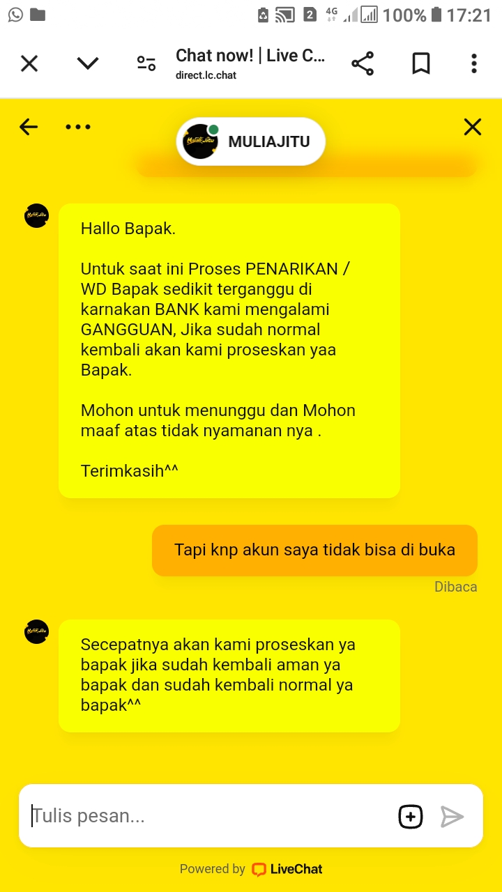 Laporan/keluhan : tolong bantu saya bosku di situs @Muliajitu di karenakan wd/penarikan dari tadi malam belum masuk bosku , dan pasa siang tadu saya mau masuk ke akun tapi tidak bisa bosku..tolong bantu saya bosku