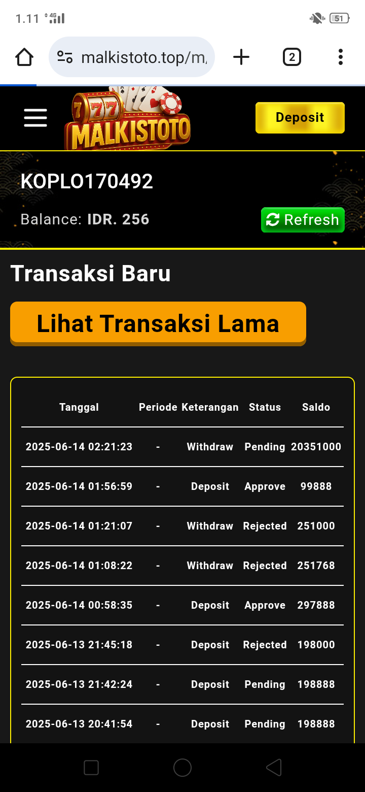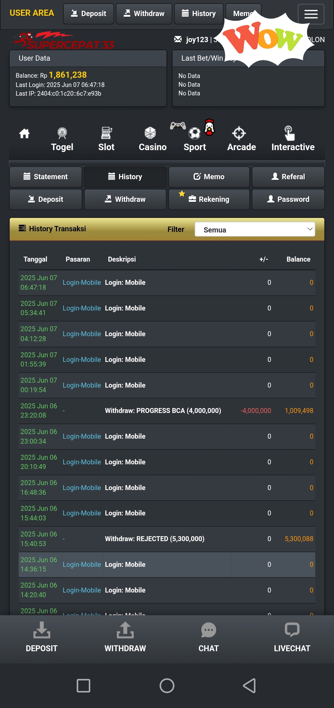 kaluhan : lagi proses wd 5.7jt tiba² keluar akun tidak bisa masuk,,giliran pas masuk sudah batal wd+ saldo malah kepasang atlantis,,padahal nggak sempet membatalkan proses wd saat akun ditolak masuk