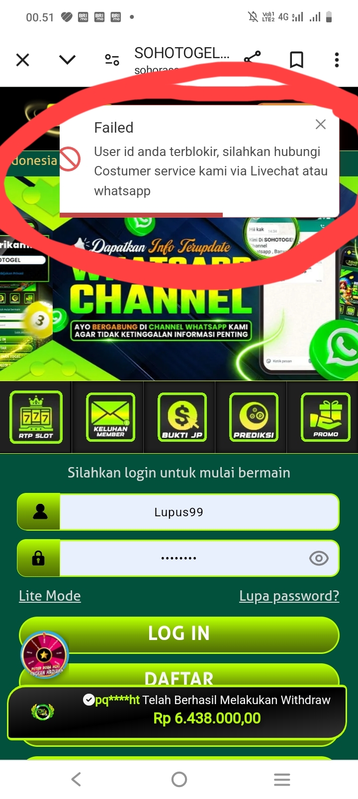 Kak, minta tolong dulu kasian saya sama kakak. Saya ini banyak hutang karna main togel di BO SOHOTOGEL. Uda ratusan juta kekalahanku main di BO SOHOTOGEL kok baru HP 1,8 jta dan saya WD 1,4 juta saya langsung di blokir. Saya tidak punya kesalahan disitu. Sya bbjfs hk 7 digit. Bantu dulu kak kasian. Hancur saya dengan perhitungan ku ini. ID LUPUS99 nomor WA 0822926449xxxTolong dulu kak di bantu kasihan😭😭😭