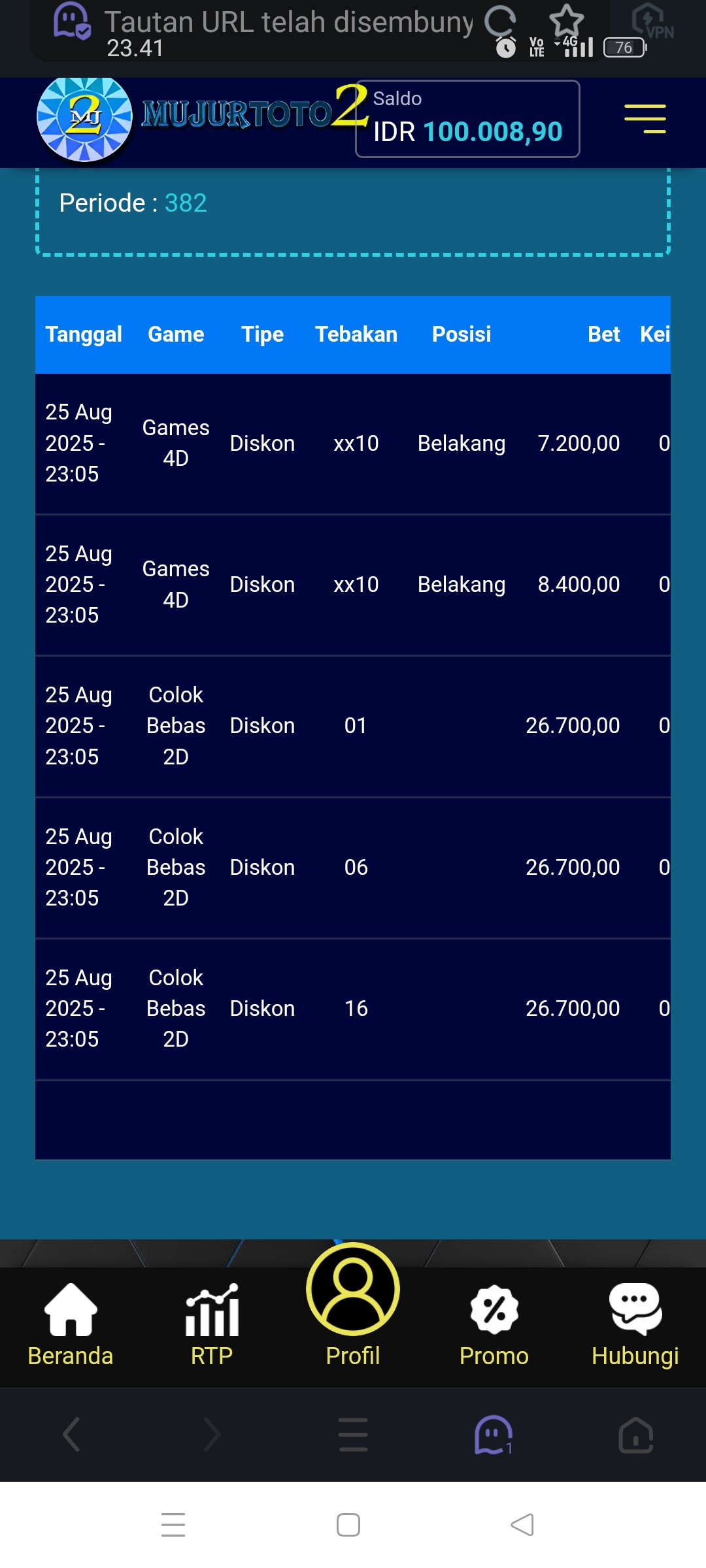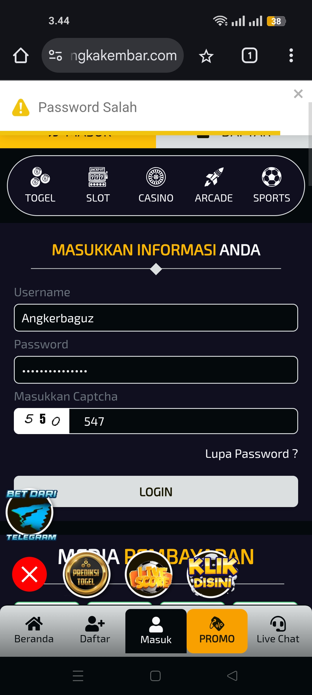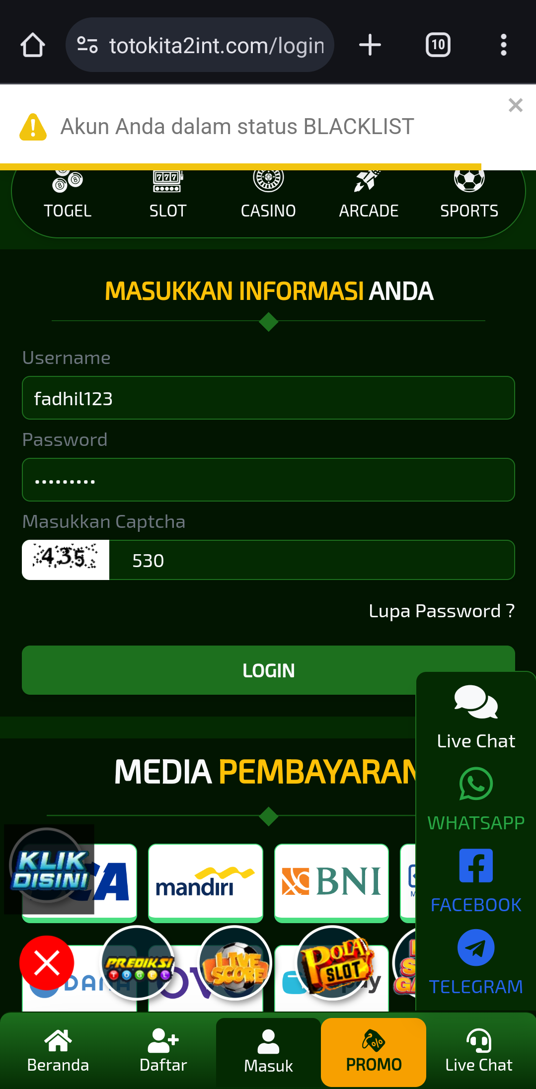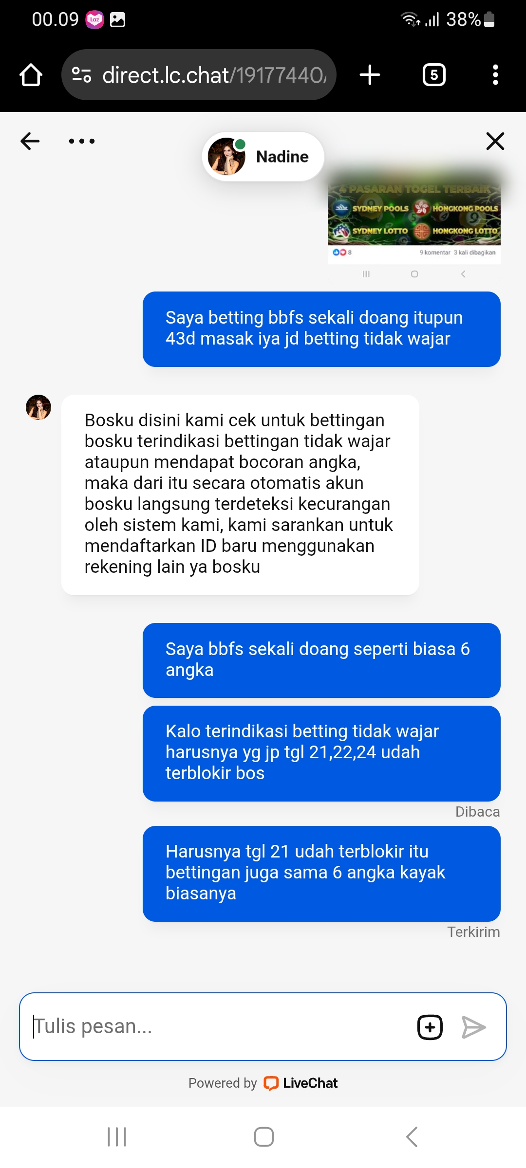 Saya betting bbfs 6 angka 600 perak JP langsung d blokir di AKARJITU..