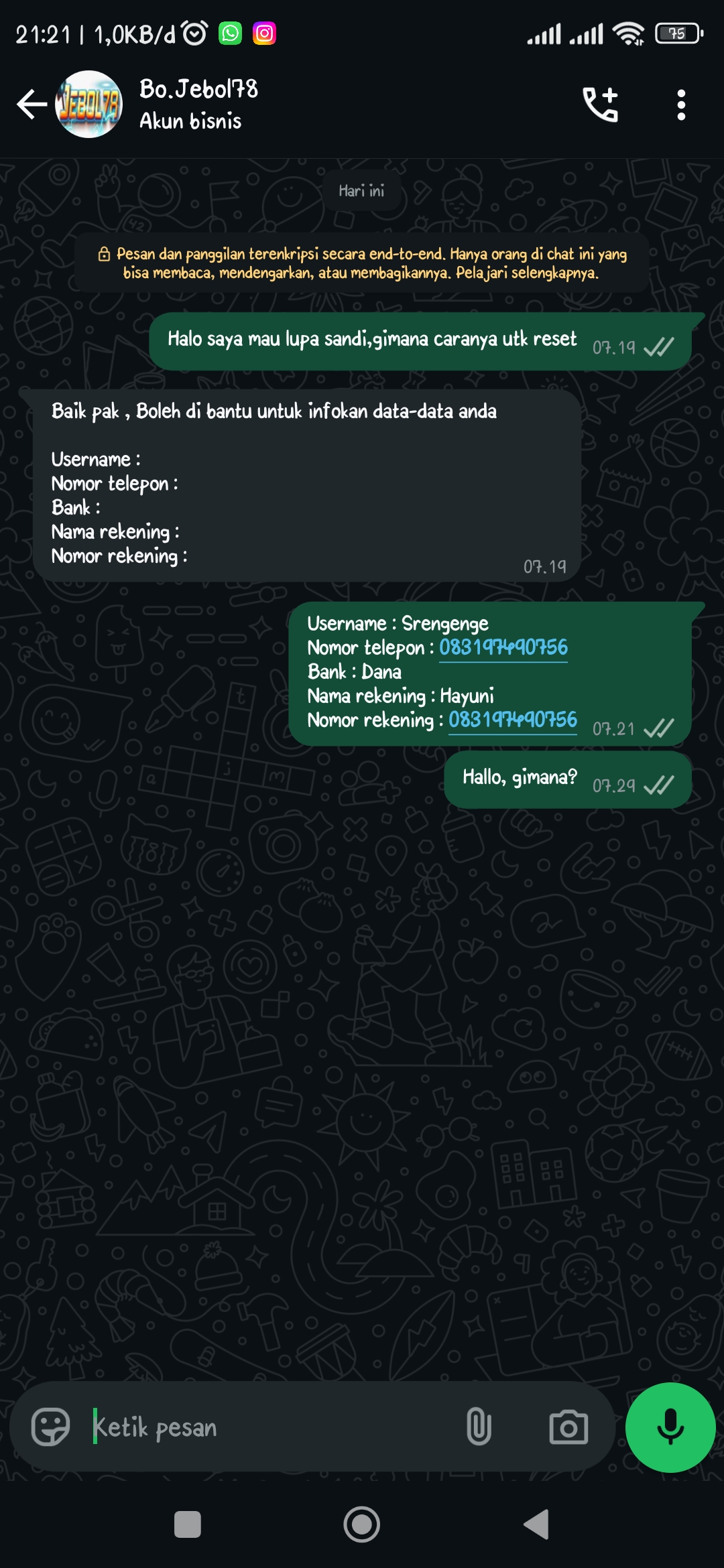 13. Bukti bukti percakapan dan akun… sebentar bos Ricard intinya bo hanya berputar putar….katanya nomor rekening salah terus