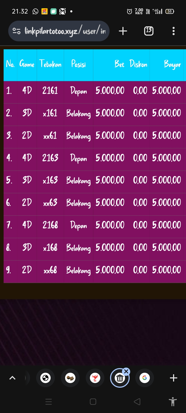 Catatan saya hanya pasang 4D nya saja… Limit bet di LOTUS4D 4D nya = 4000 Line.