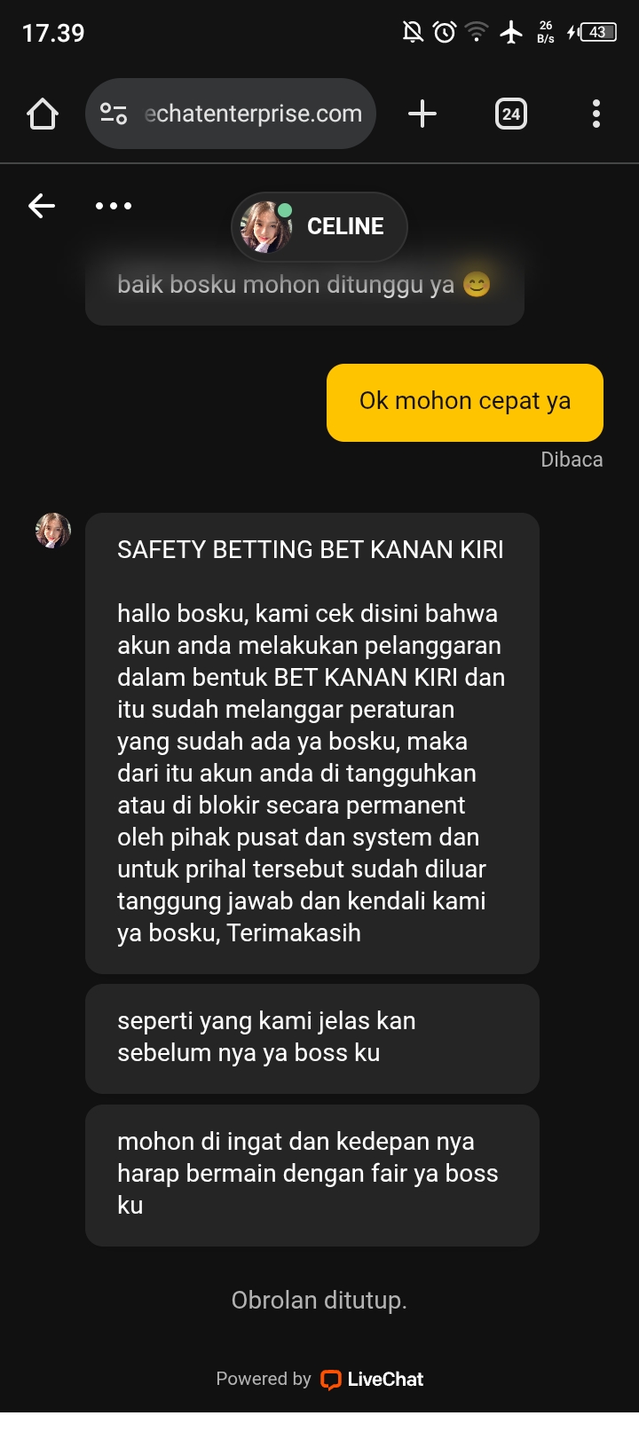 47. Saya sdh tanyakan di live chat,di wa juga,nagh ketika betingan sblm jp aman² saja,tapi setelah jp 2d cuma di x7 akun saya langsung di blokir..ini ss nya