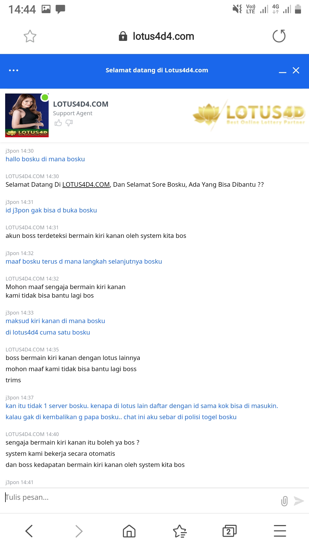 2. Gw udah 3thn an main di lotus4d sob, sejauh ini aman2 saja. Gw pernah JP 100jt di bayar lunas sob.gw bukan antek lotus4d, gw murni player. Mungkin anda melanggar peraturan sob.