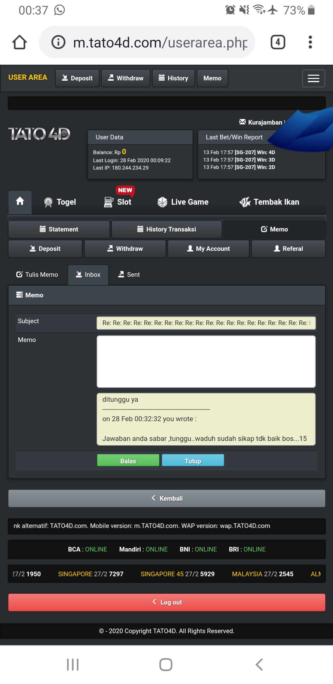 Sukatogelonline,net padahal saldo saya masih sekitar 4jutaan