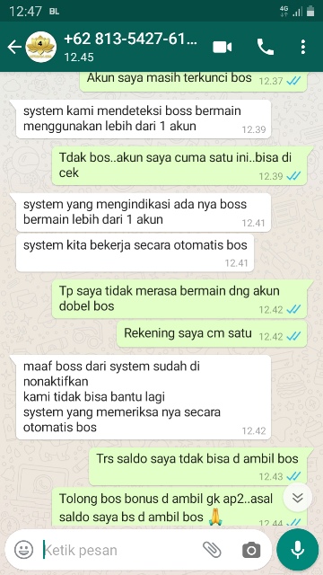 2. Sya jp hk 2d gsbesar 560rbu d Bo Mister.pas wd ga masuk2 sya log in mlah terblokir n chatt d suruh depo lg 10rbu,stlah chatt tnya wd y mlah chatt lngsung d putus n ku wa,malah wa y d blokir.tolong d bantu bos,,,,,BO Y MISTER4D