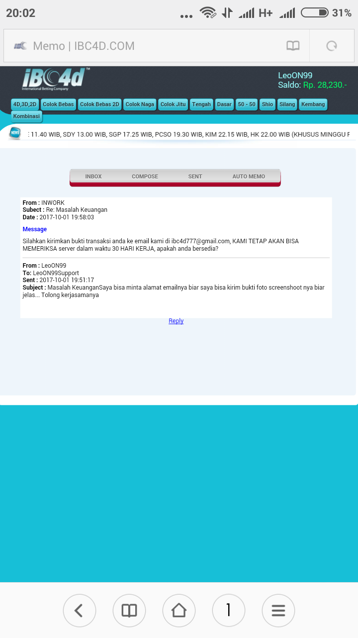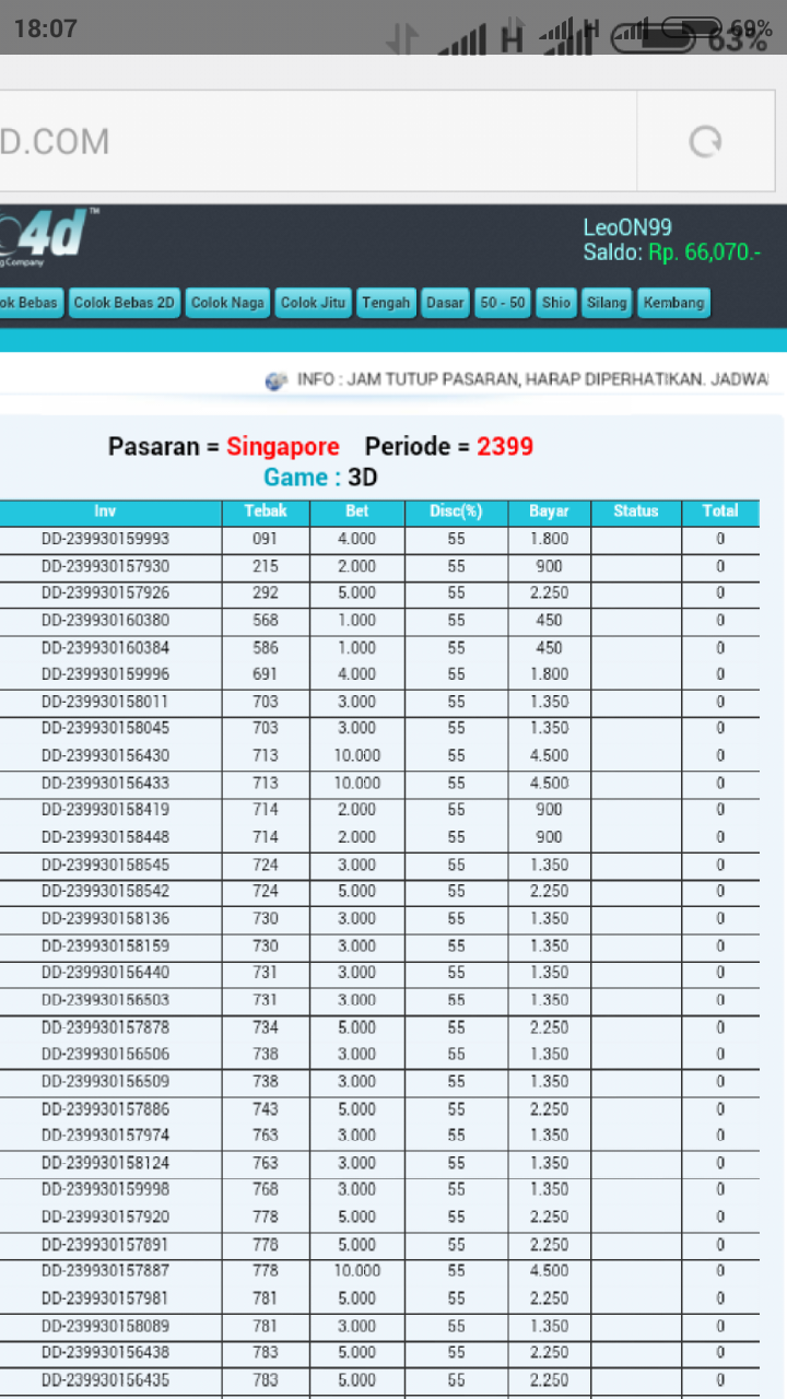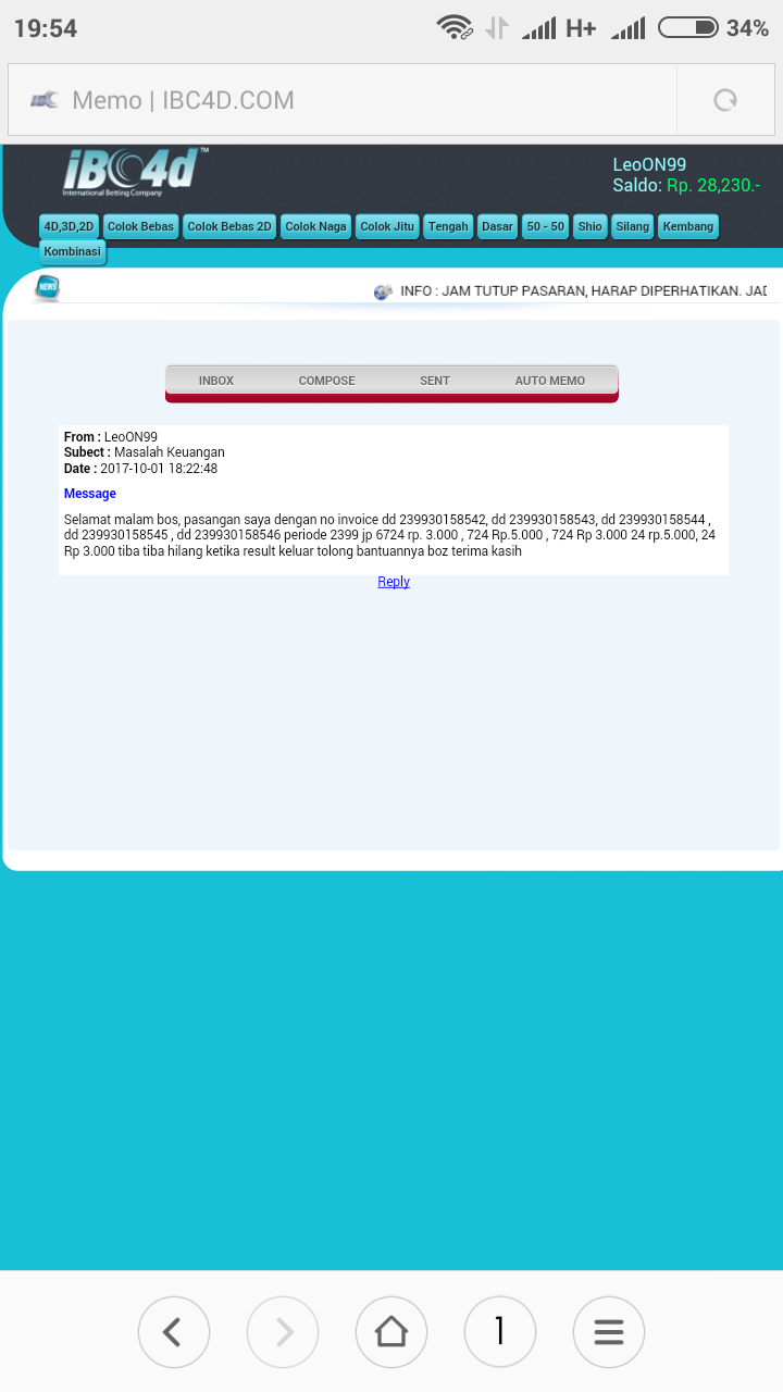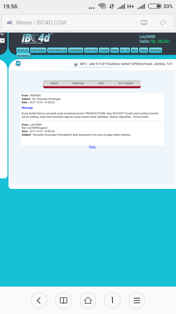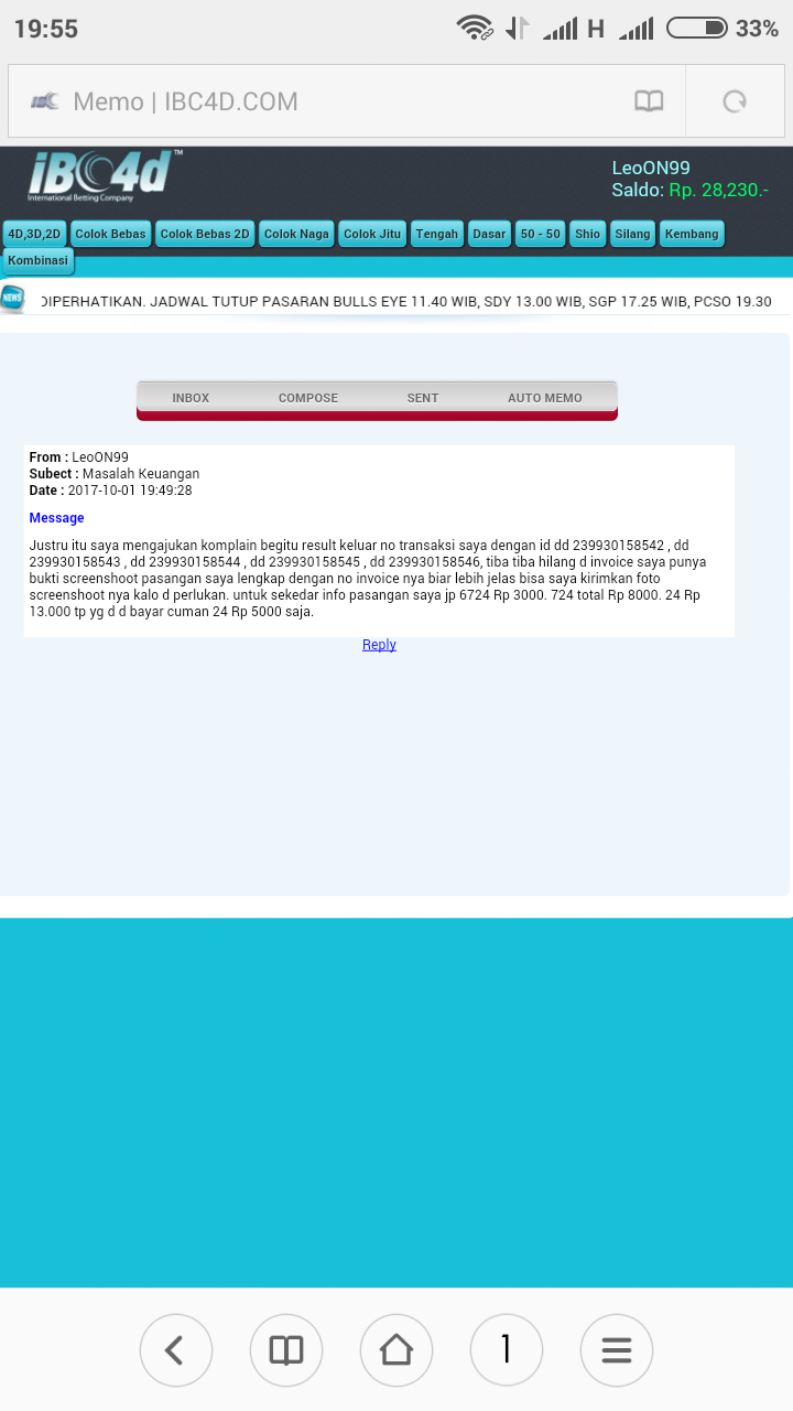 Bos, saya user ibc4d.com dengan nama user leoON99. Saya melakukan betting pasaran Singapore hari ini dan jp 6734 Rp 3000, 724 Rp 8000 , 24 Rp 8000. Semua ada bukti transaksi / no invoice nya ( screenshoot an ) tp setelah result keluar betting saya d hilangkan pihak IBC4D.COM setelah mengajukan komplain k pihak bersangkutan saya d janjikan proses pemeriksaan selama 30 hari kerja Krn harus melihat server d Amerika. Saya mohon bantuannya boz apakah memang waktu yg d butuhkan selama itu atau memang ada indikasi tidak baik dr pihak ibc4d ..