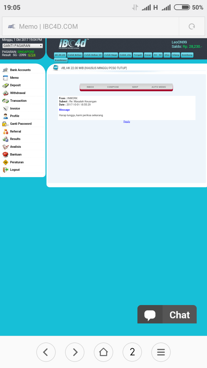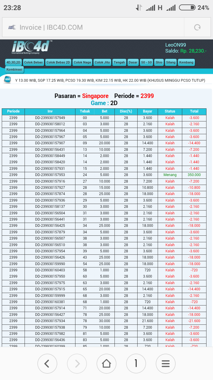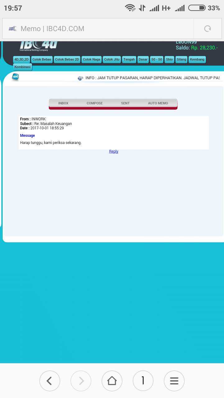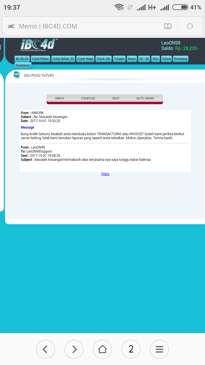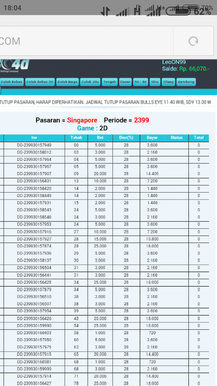Bos, saya user ibc4d.com dengan nama user leoON99. Saya melakukan betting pasaran Singapore hari ini dan jp 6734 Rp 3000, 724 Rp 8000 , 24 Rp 8000. Semua ada bukti transaksi / no invoice nya ( screenshoot an ) tp setelah result keluar betting saya d hilangkan pihak IBC4D.COM setelah mengajukan komplain k pihak bersangkutan saya d janjikan proses pemeriksaan selama 30 hari kerja Krn harus melihat server d Amerika. Saya mohon bantuannya boz apakah memang waktu yg d butuhkan selama itu atau memang ada indikasi tidak baik dr pihak ibc4d ..