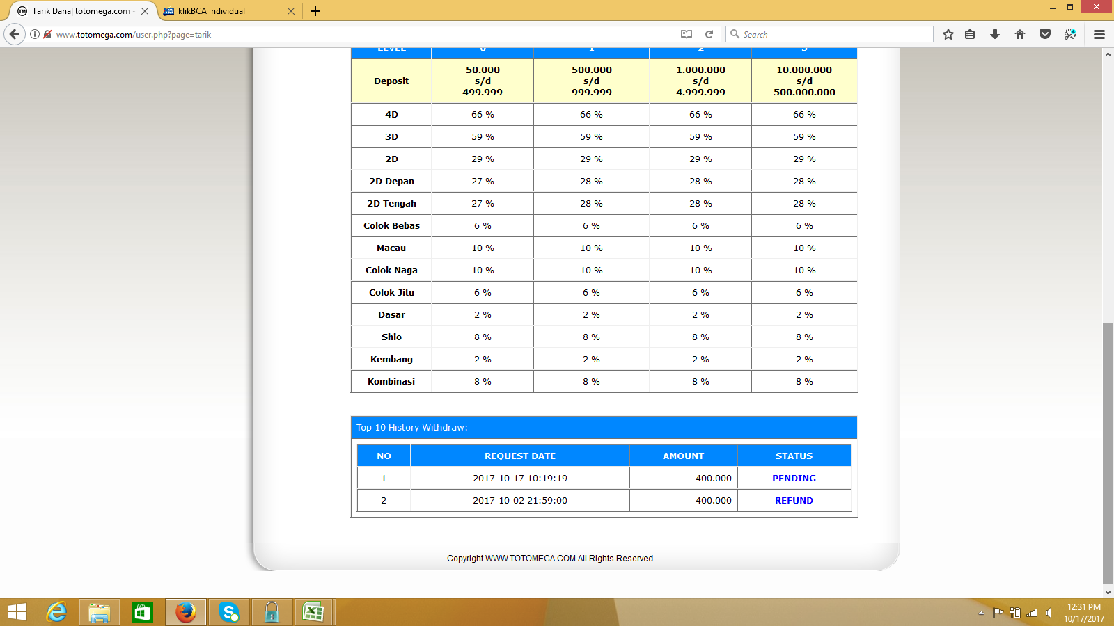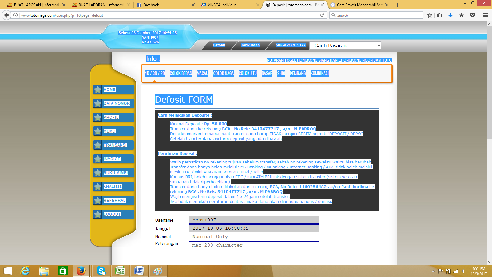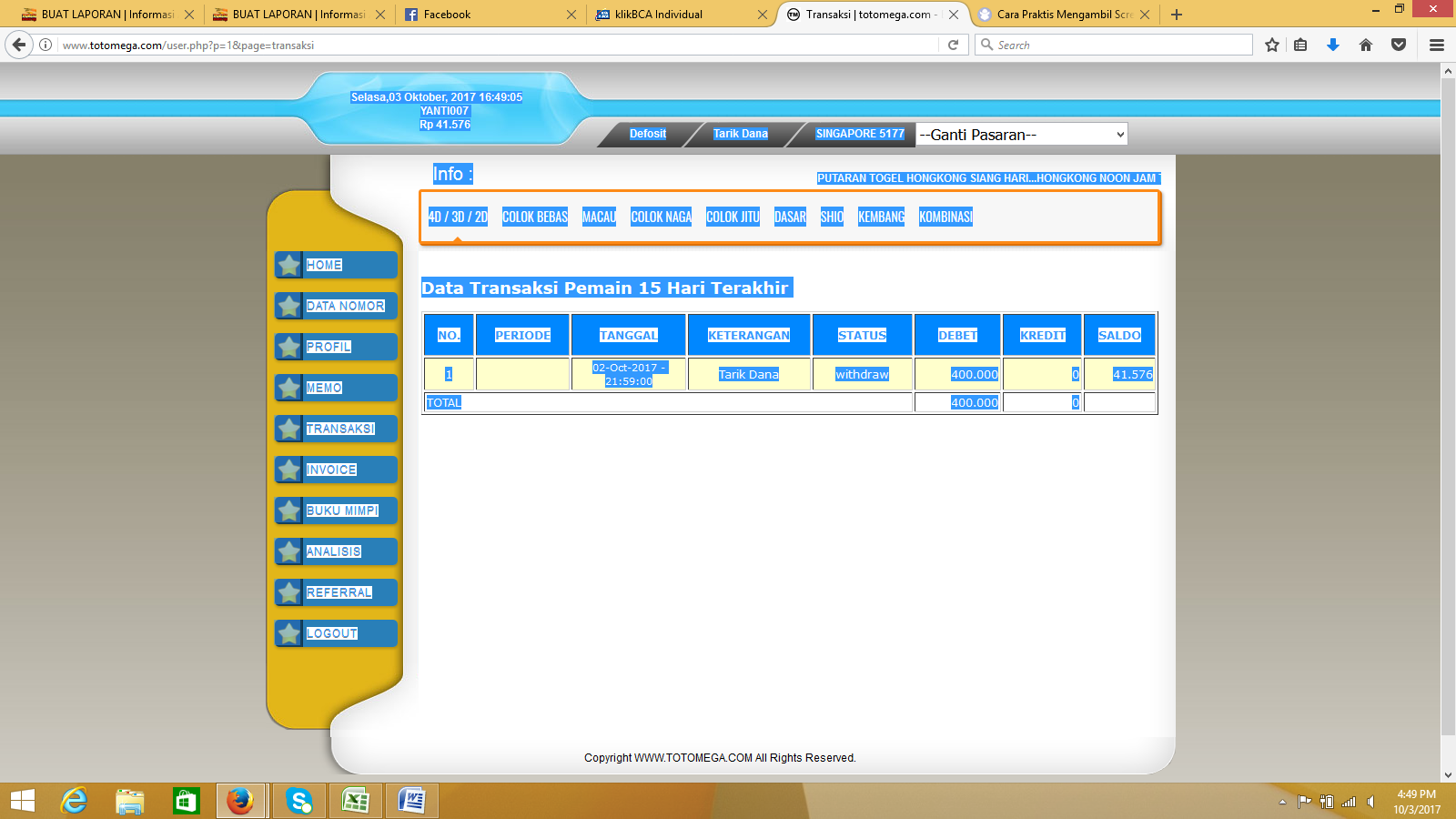 berikut bukti transfer saya, transaksi selama 15 hari, dan rekening totomega. tolong dibantu penyelesaiannya bos.