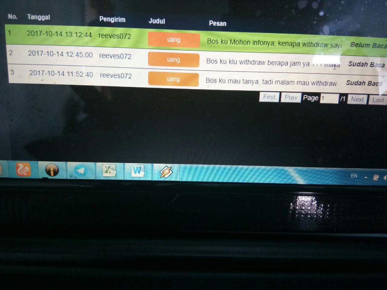 26. tgl 1/10/2017 saya ada transfer Rp. 1.500.008 ke Totomega untuk Deposit. Tapi tiba2 admin totomega bilang tidak bisa approved karena dana belum masuk. dan saya kirim bukti transfer saya ke admin, tp dia bilang rekeningnya tidak pakai lagi dan hubungi call center bank. dan saya sudah hubungi ke bank minta konfirmasi pengembalian dana dari rekening yang salah transfer (totomega). saya hubungi admin via memo tidak ada balasan. saya tarik dana saya yang masih ada dideposit Rp. 400,000 juga tidak masuk direkening.