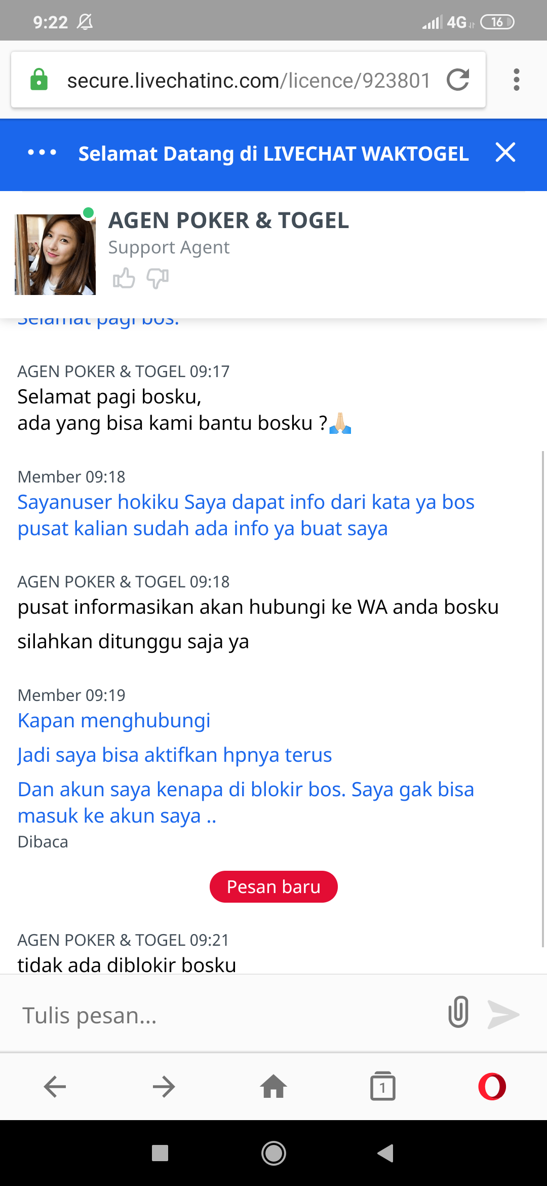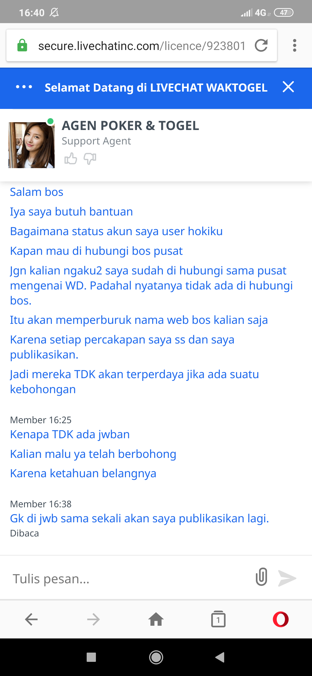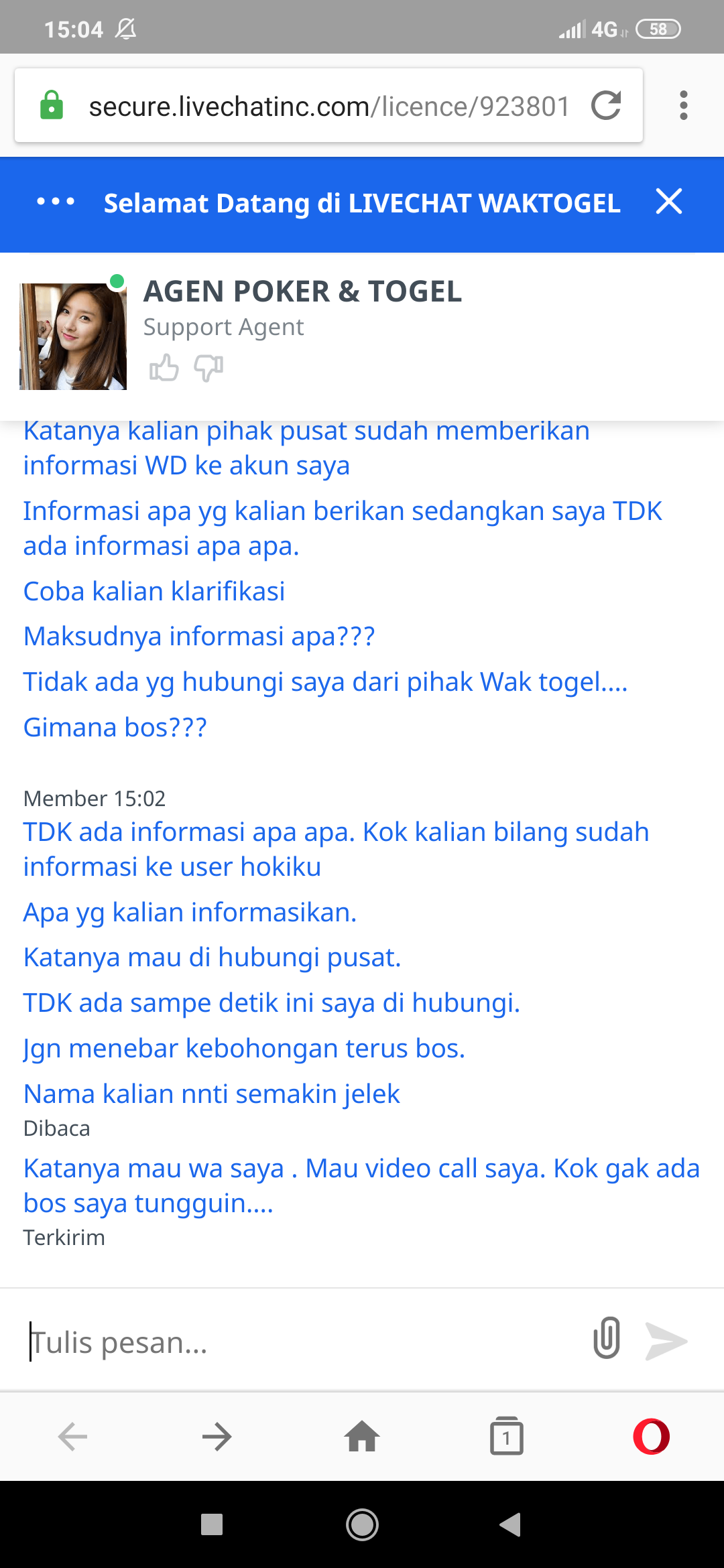 38. Ini sudah sebulan lebih masalahnya bos berjalan. Dan TDK ada info atau titik terang bagaimana dengan saldo saya itu untuk wdnya. . . Mereka cuma pernah bilang tunggu ya sedang investigasi. Apa yg di investigasikan??? Saya tunggu. Ternyata sampe 1 bulan lebih skrg ini dana juga TDK di proseskan. Logika gak??? Masa cuma investigasi begitu. Waktunya sampe 1 bulan gitu. Mau saya cuma satu saya cuma mau WD saja itu ke rekening yg terdaftar itu saja. Saya tetap main di waktogel. Jika mereka memang ada niat baiknya kemarin. . TPI kalau bgni apa mau di bilang. Saya live chat. Saya wa. Tapi gak di respon lg.