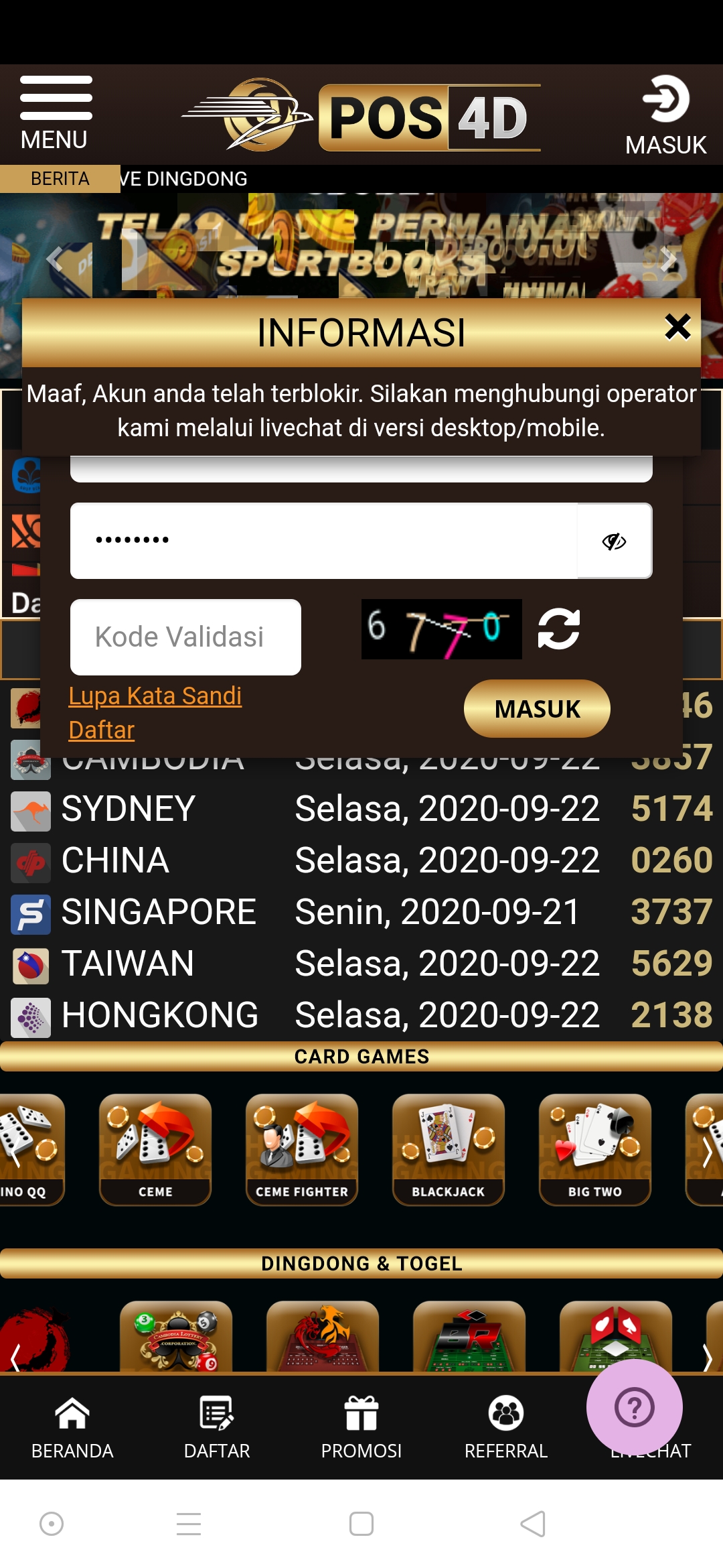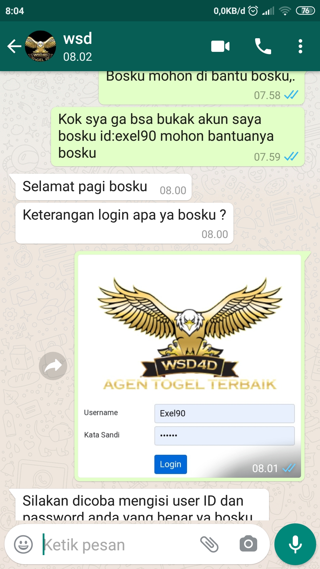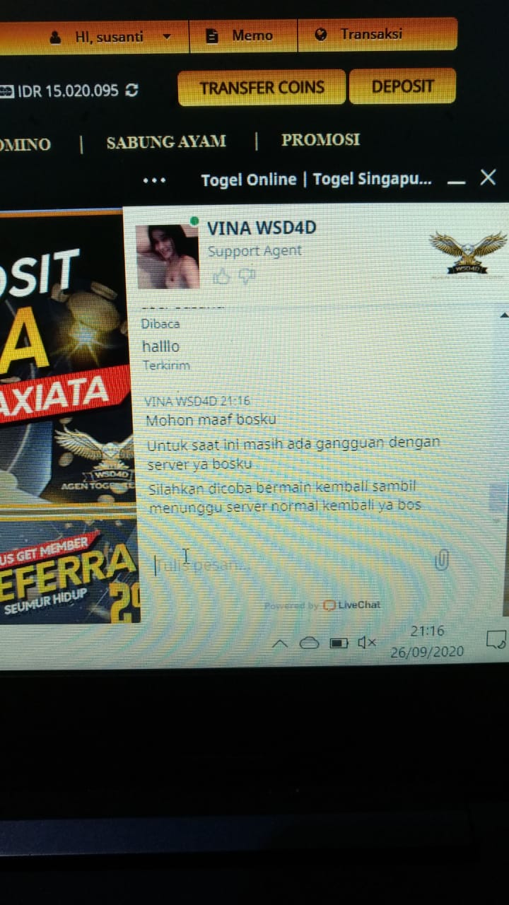 Laporan / Keluhan : akun tidak bisa login setelah jp di pasaran HK 22-09-2020, SANDI langsung di ganti mereka, reset sandi di permasalhkan mereka,lewat live bilang salah email dan no. Hp sedangkan chat lewat WA bilangnya salah pasword dan email, jadi keterangan beda-beda, padahal benar itu email yg sya daftarkan
