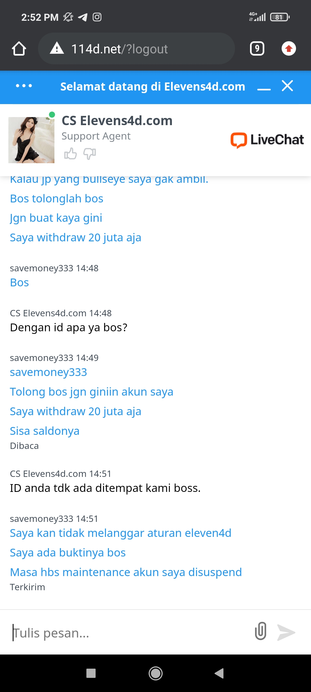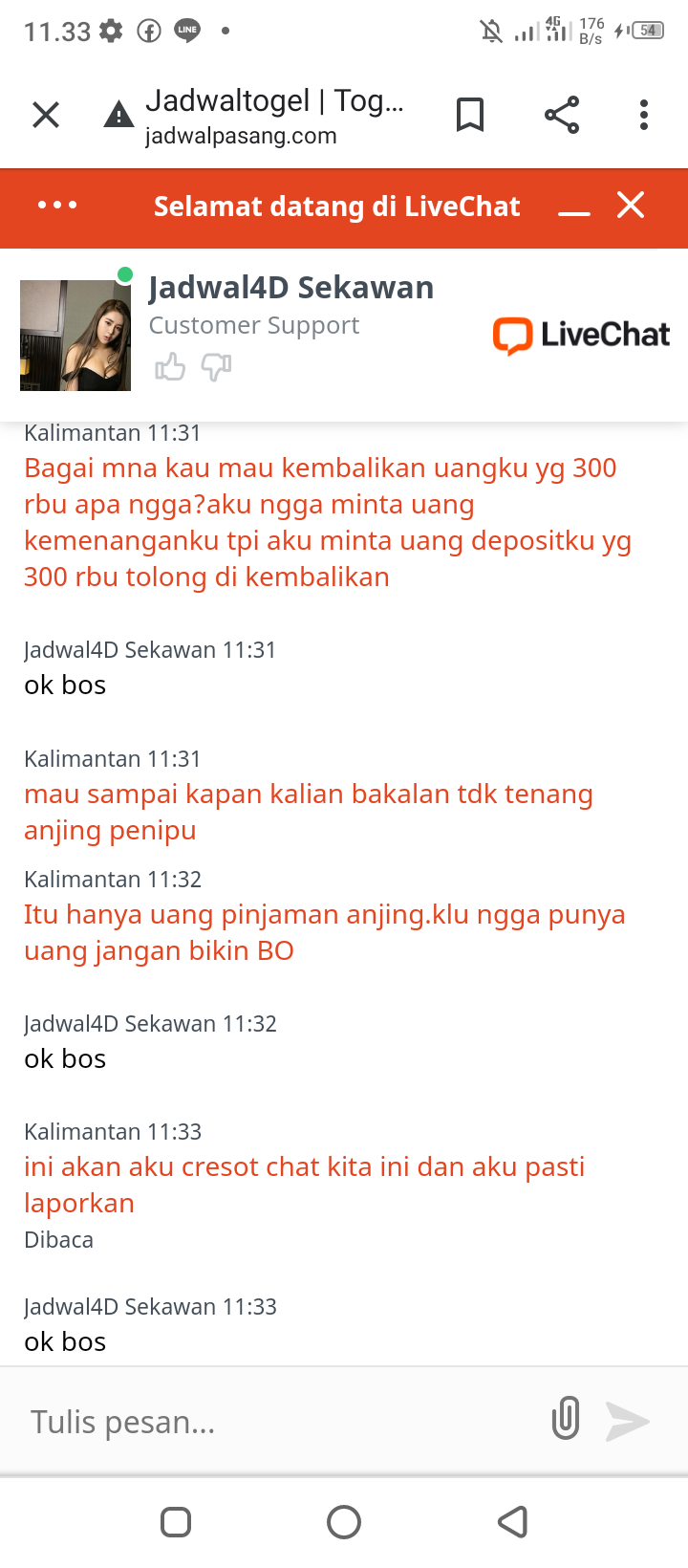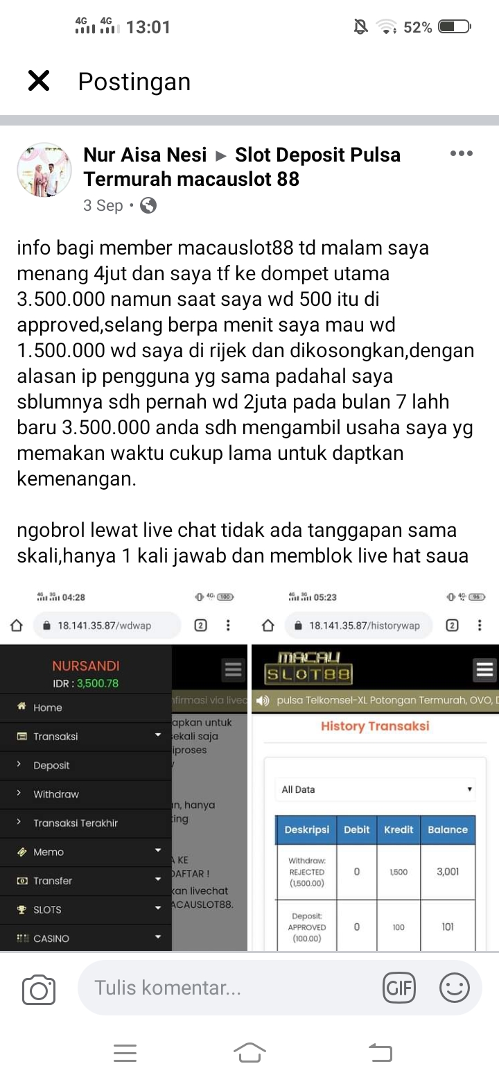 1. sob , coba la di tahan dikit emosi nya ya , ini saya sedang chat sama pihak jadwal4d mereka sengaja block akun sobat di karenakan mereka sudah tidak mau terima lagi sobat bermain di sana , dan juga dia akan mengembalikan secara manual uang sobat yang ada disana … di karenakan sobat sudah menyebar luas kan maslah ini ke sosmed mereka menahan uang sobat ,,, ini saya sedang berbincang sama jadwal4d untuk mengembalikan uang sobat yang ada di sana tapi mereka minta sobat untuk mencabut laporan yang sudah di sebar luas kan setelah sobat klarifikasi pencabutan laporan ke sosmed silahkan sobat ss kan bukti nya lalu sobat hub mereka via live chat kasih bukti ss nya sana, atau sobat lampirkan disini aja ss klarifikasi laporan nya ke sosmed