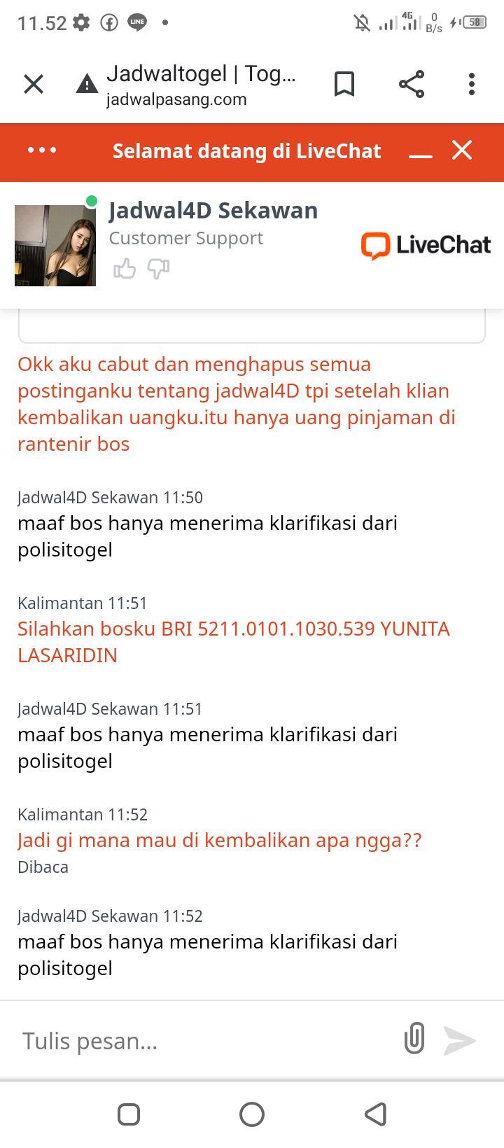 3. Bos,aku tertipu di BO JADWAL4D.aku jp lansung di blokir.dan aku minta kembali uang pasangan ku yg 300 rbu mereka ngga kasih.ID GASDE99 NO.REK.BRI 5211.0101.1030.539 YUNITA LASARIDIN.ini langsung di blokir dr BO JADWAL4D