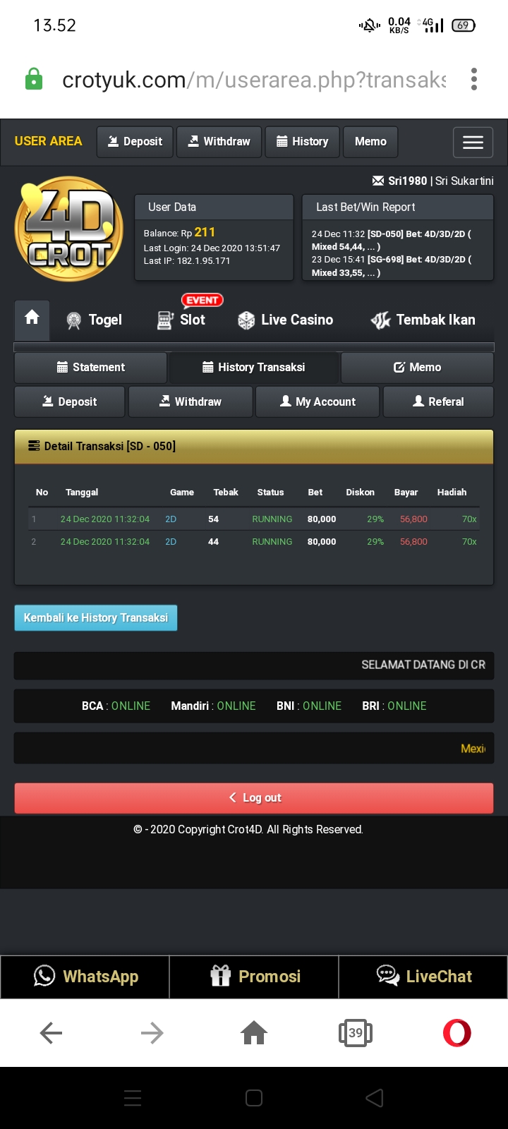 Result 20 tidak dibayar.. malah di kembalikan bettingnya