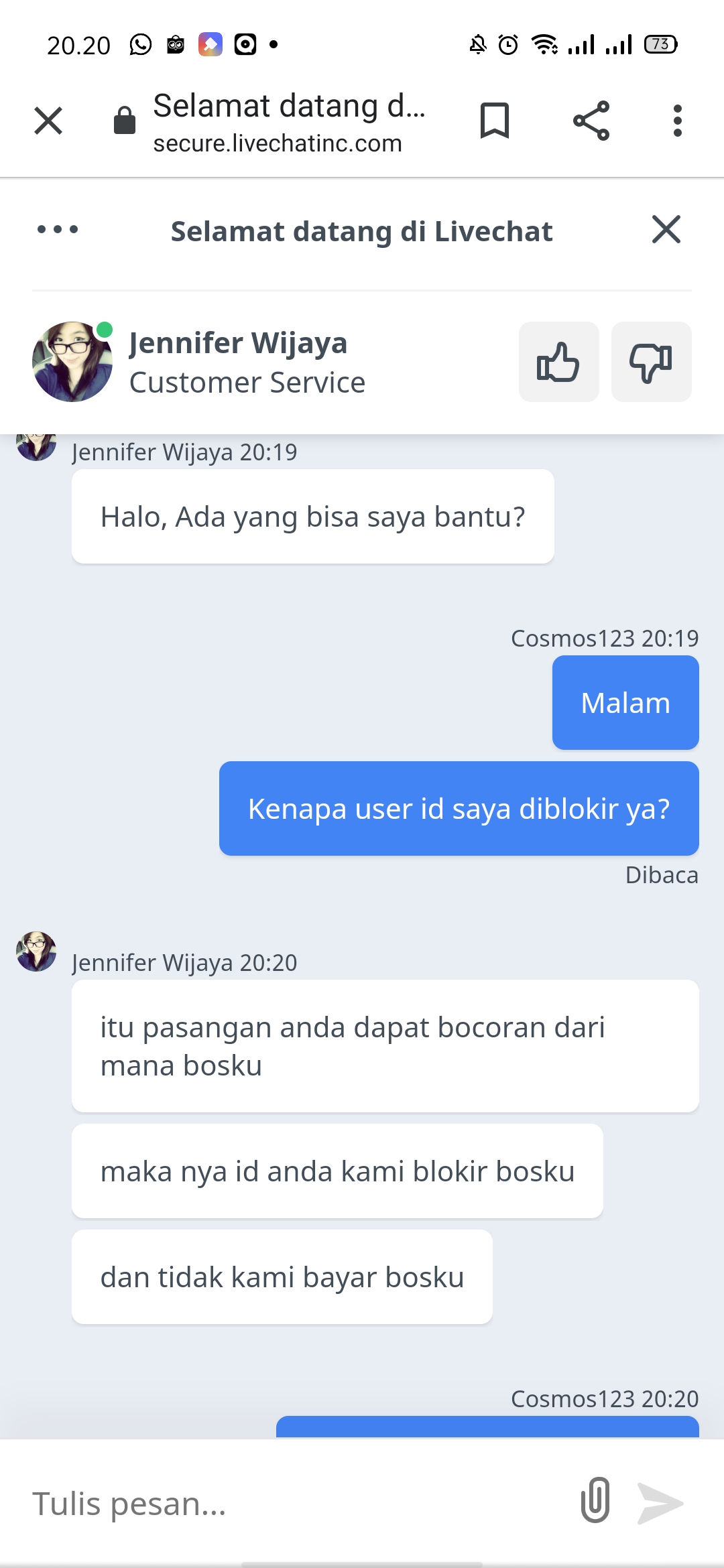 Kmrin saya dftr salah rek ..kebalik saja salahnya di bilng saya melakukan ke curangan buat ambil bonus new mmber …saya gak sengaja wktu itu saya ngantuk pas dftr…tdinya bilng ke samaan ip..pdahal hp baru..dan buat main slot baru…dan trus saya komplain trus..bilang alesan lain lgi…trus saya wd 1200 gak di proses akun di block…tolong lah situs tampilan kayak mbok itu di blockir semua udah bnyak korbanya…kasihan member kalau ada situs gak bonafit kek gitu…minta foto buku tabungan udah saya kasih foto sama vidonya malah akun di block