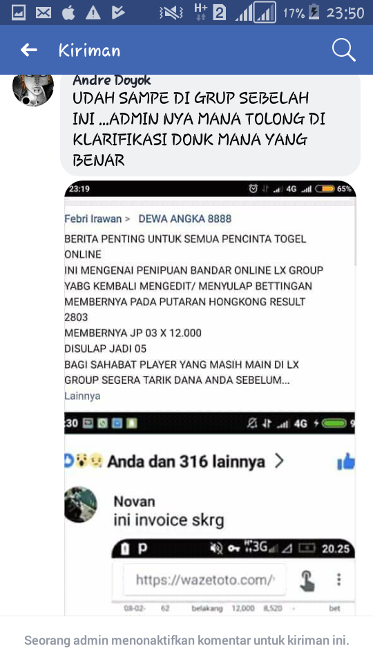 Bos admin.. tolong selidiki LX group. yang akir” sering ada yang komplain kecurangan.. mengedit bet memberbya.. dan di grop nya main blokir apabila ada yang bantuin pihak korban.. tadi ada yang komplain.. malah di block.. grop fbnya dewi dewi togel 3.