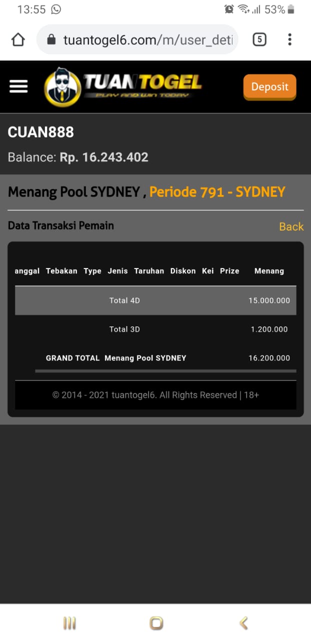 Laporan / Keluhan : Menang 4D sydney di Tuantogel6.com 16.000.000 sudah 24 jam dana tidak cair alasannya sedang proses dan tidak ada batas waktu proses. akun saya awalnya tidak bisa di buka karna salah password. dan ternyata password sudah di ganti oleh pihak tuantogel.