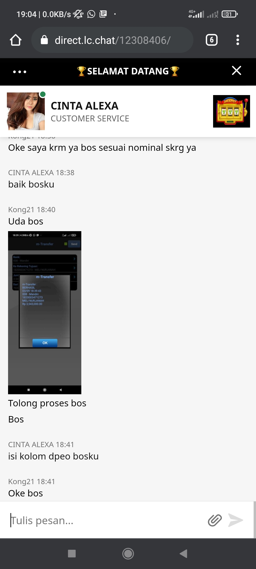 deposit di reject, minta struk bukti transfer sudah saya kasih.. pertama bilang sampai alasan bank offline padahal transfer dari sekitar jam 10:55, sampai pagi saya chat, terlalu pasif kasih jawaban. pagi2 sekitar jam 8 atau 9 bilang lagi2 main tennis alias maintenance, oke saya coba kirim form lagi siang tetap sama keterangan rejected.. terakhir di tangani yg pake nama cs daiva, jawabnya menunggu antrian.. sedangkan bo lain aja yg laris manis aja menunggu tapi jelas masuk. ini form di rejected tapi jawaban menunggu antrian. bukti screen shot transfer saya ada, dan bukti2 screenshot chat sampai jam ini juga masih lengkap.