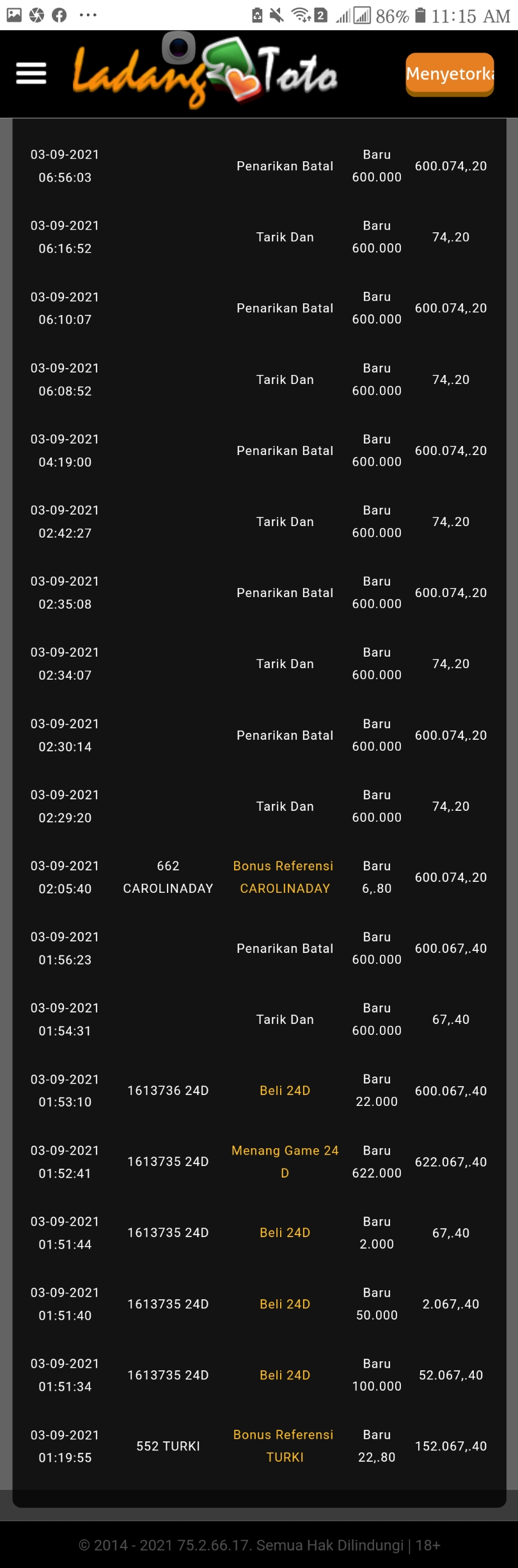 2. ini bukti sejarah dari pemasangan sampain menag 2dx25ribu..dan withdraw di aproved tapi dana tidak masuk di no req saya dan chat di live chat di blokir tidak bisa bula