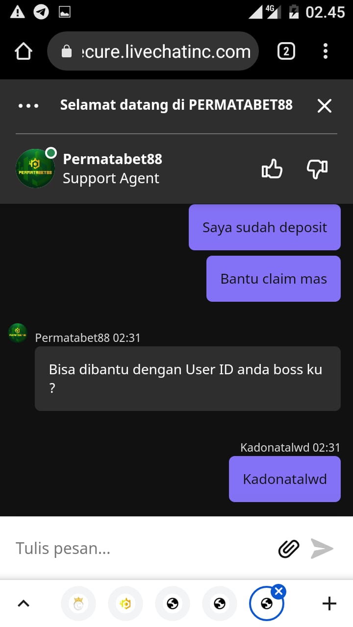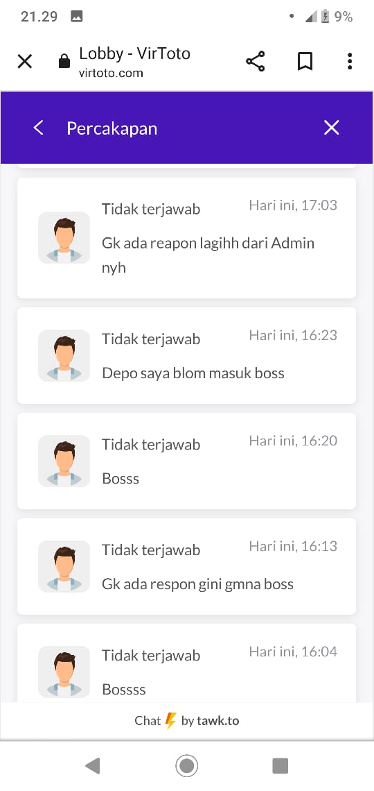 Saya mau lapor bang deposit saya tdk diproses udah 2 hari saya deposit di VIRTOTO dan Admin BO nyah susah d hubungi di livechat tidak d balass d wa tdk di balas di telpon tdk di angkat. Deposit saya sebesar 1000000
