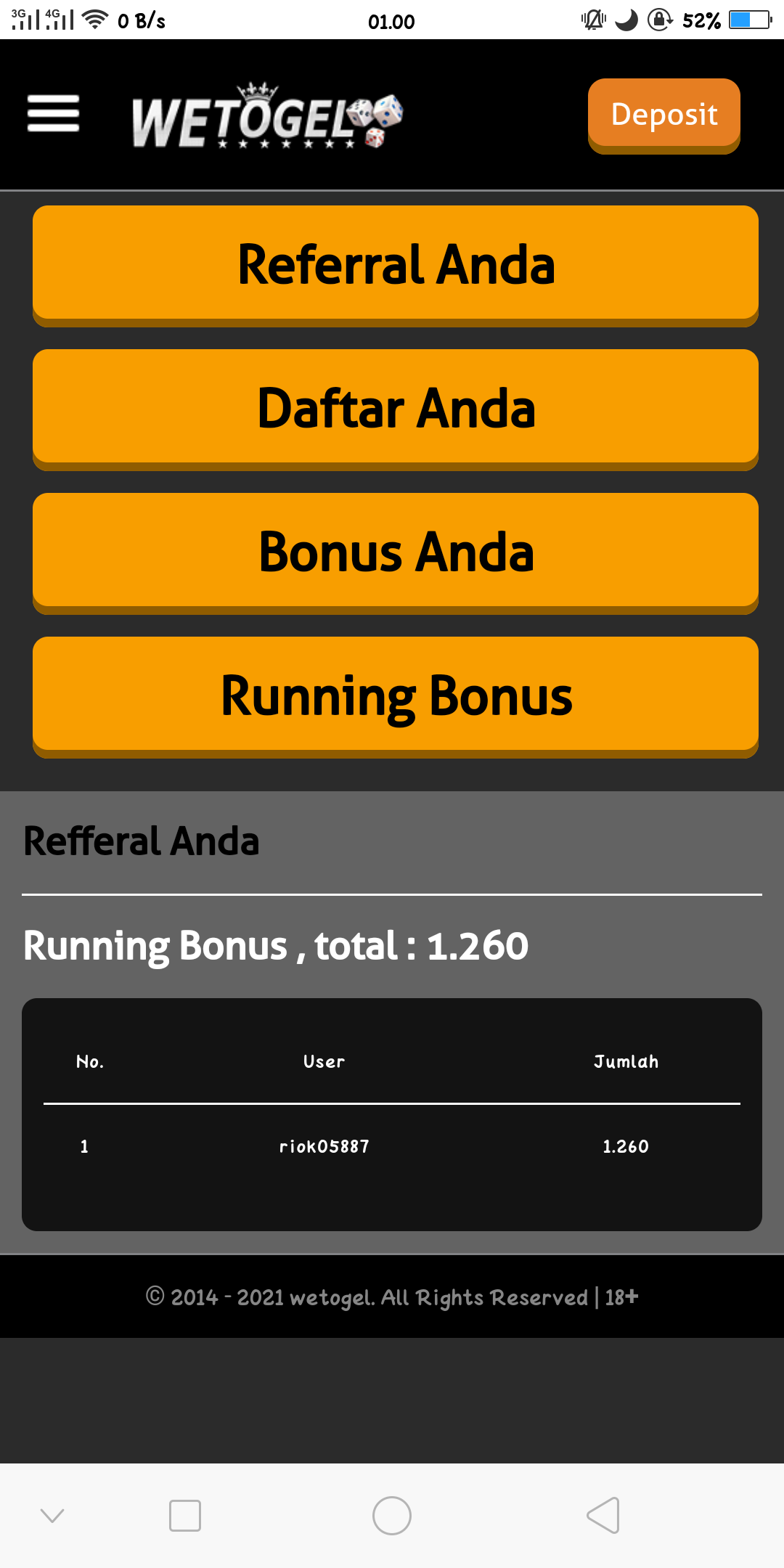 Laporan / Keluhan : b.o wetogel gak jelas …bonus referral di surunggu 1×24 ….hati2 main disna bosku