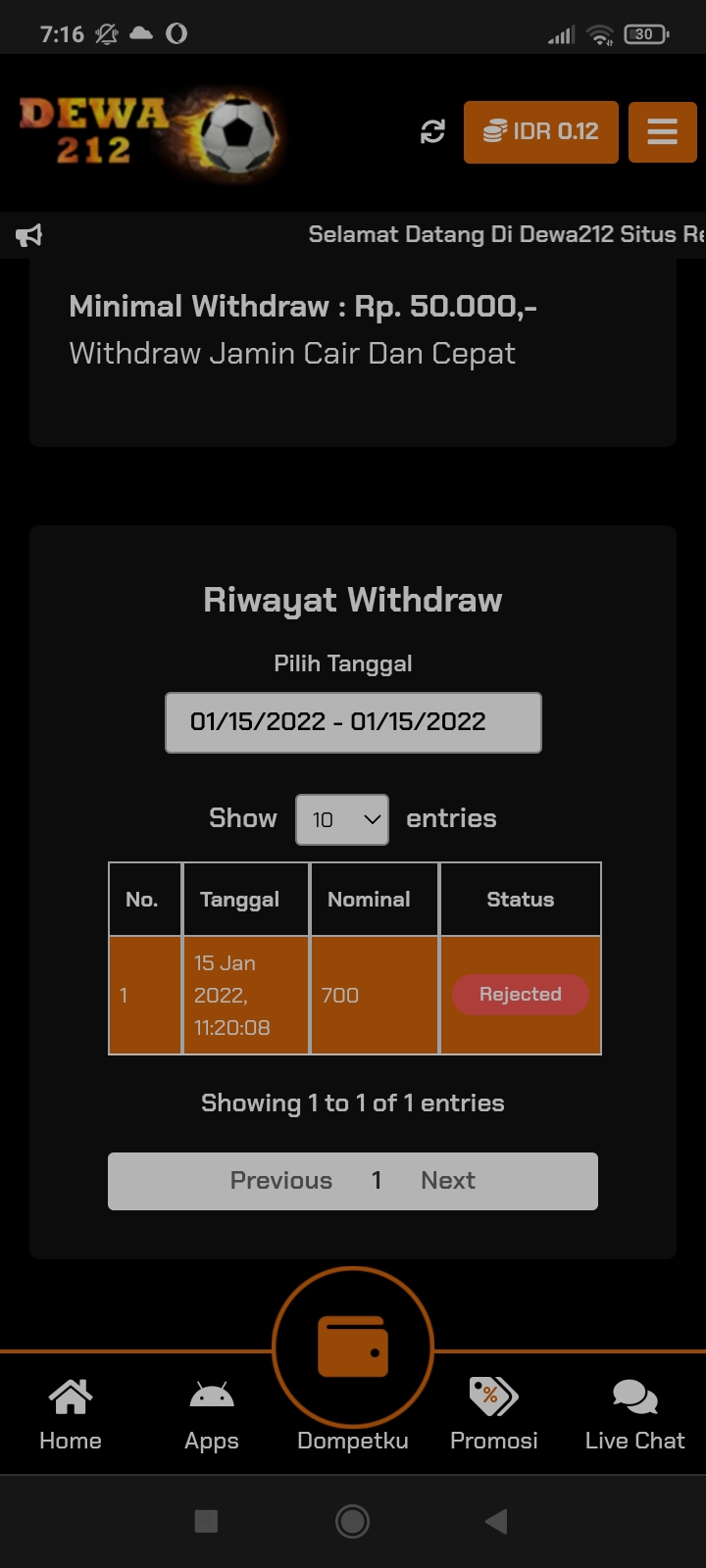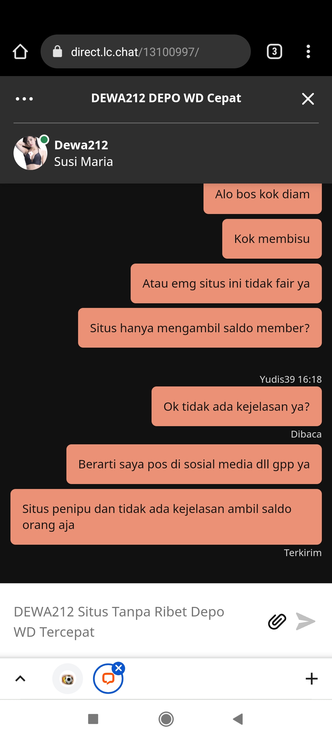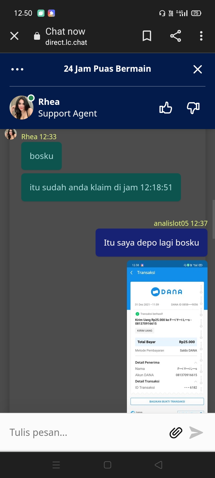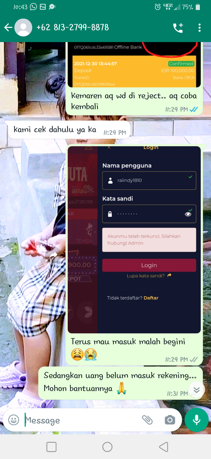 Awalnya pas WD pemberitahuan di reject.. ketika sama mau WD kembali akun saya malah dikunci. Saya hubungi admin situsnya minta di kirim 25rb untuk buka akun.. saya sudah tf 25rb.. sampai saat ini akun saya belum bisa di buka/di kunci.. dan setiap saya live chat atau WA mereka sudah tidak menanggapi saya lagi ..