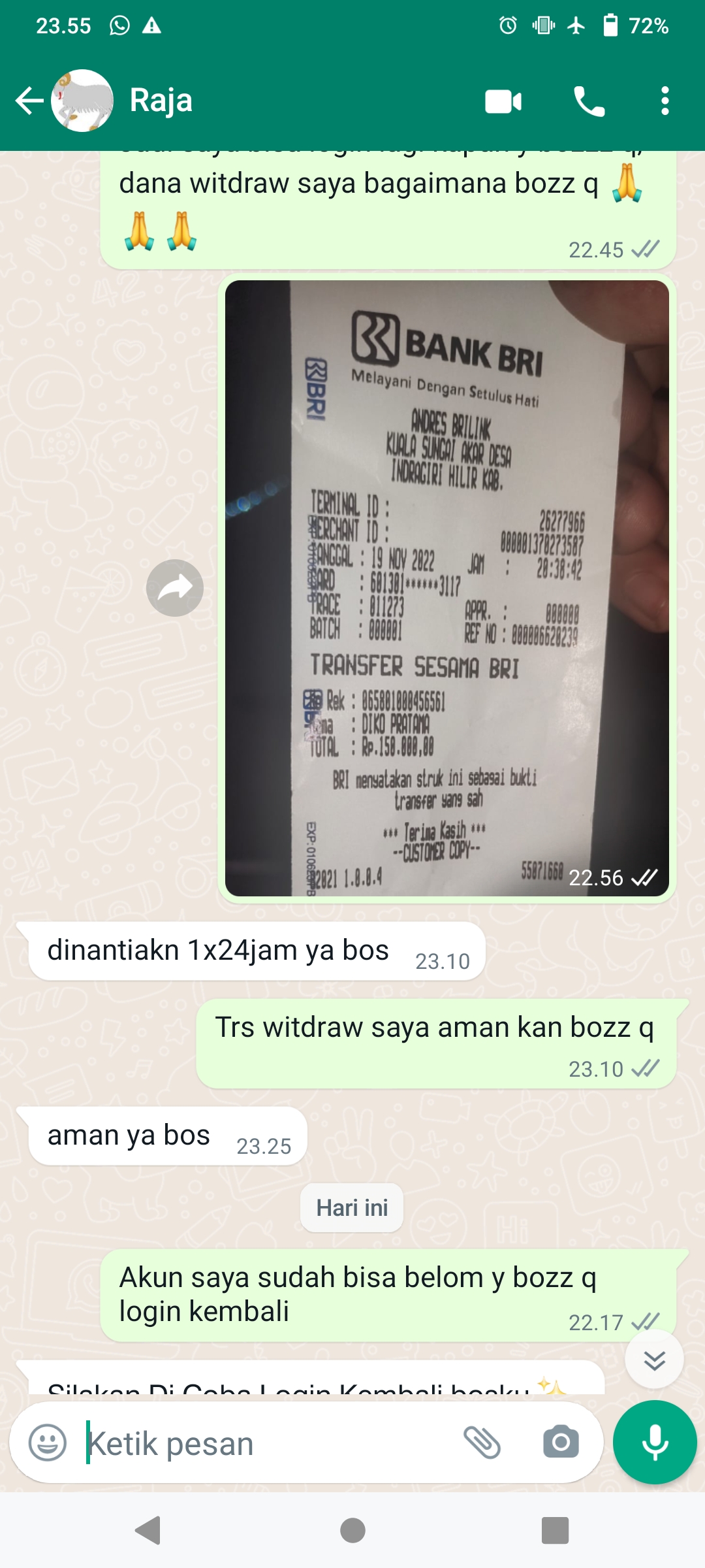 masih banyak bukti chat nya, di kira kita mau makan uang WD dia , tapi disini hanya menjaga keamanan akun member , jadi kita menyruh member tersebut depo menggunakan rek dia sendiri, dan deposit yang member kirim akan masuk ke saldo permainan member tersebut. tapi kita di tuduh yang tidak tidak. dan mengancam kami di polisislot, jadi kita meminta untuk member lainnya yang menilai.