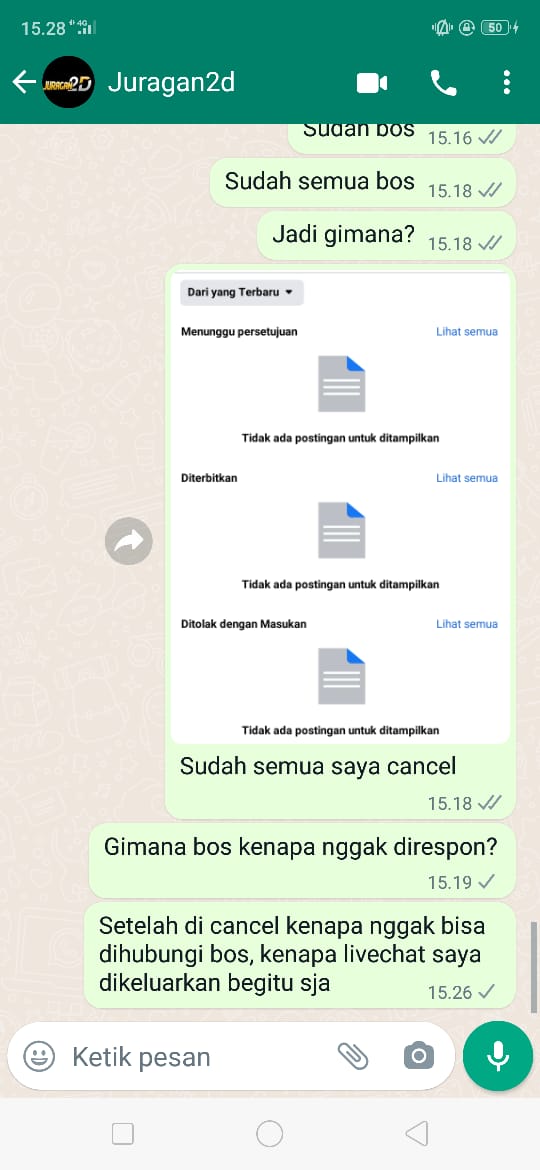 42. Untuk BANG RICHARD LAPORAN untuk JURAGAN2D tolong dibatalkan karena sudah ada konfirmasih dari pihak CS JURAGAN2D